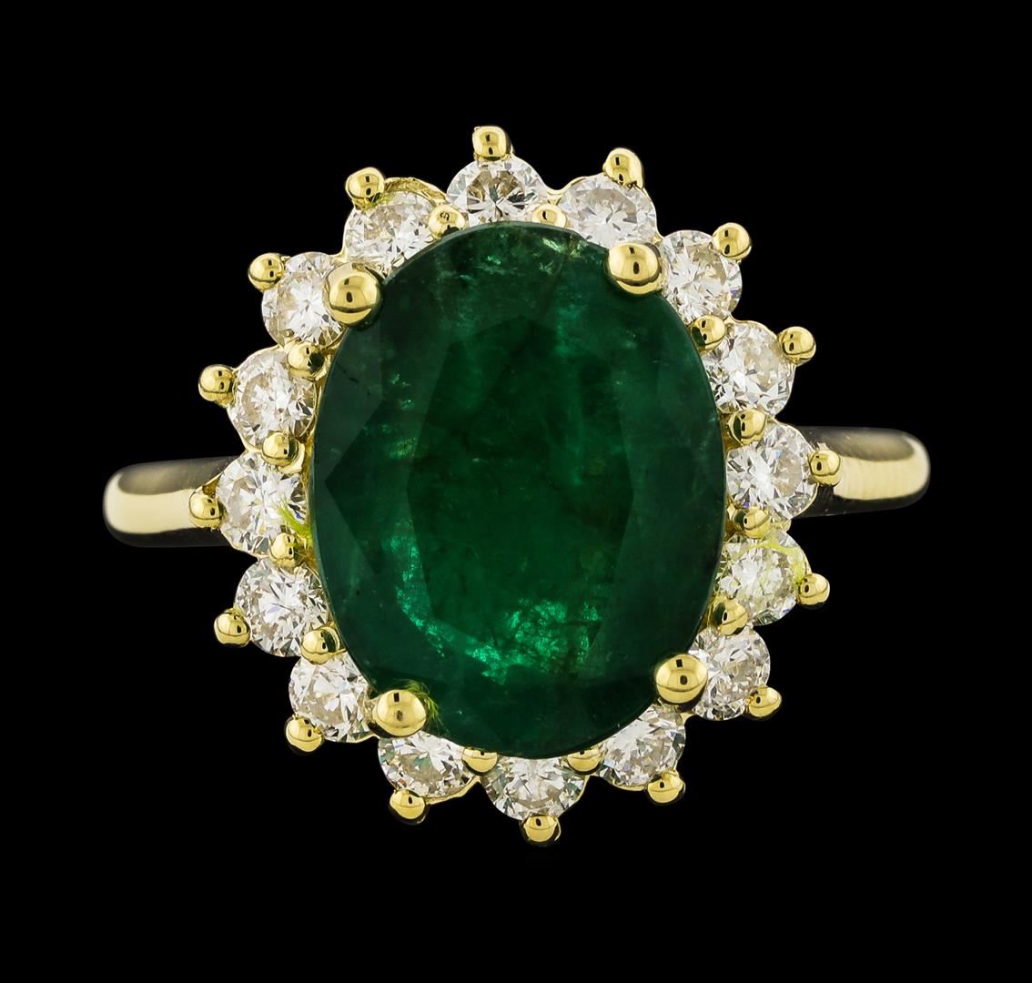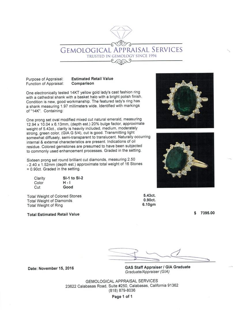 One electronically tested 14KT yellow gold lady's cast fashion ring with a cathedral shank with a basket halo with a bright polish finish. The featured lady's ring has a shank measuring 1.97 millimeters wide. Identified with markings of '14K'. Condition is new, good workmanship. Containing: One prong set oval modified mixed cut natural emerald, measuring 12.94 x 10.04 x 6.13mm, (depth est.) 20%. bulge factor, approximate weight of 5.43ct., clarity is heavily included, medium, moderately strong, green color, (GIA G 5/4), cut is good. Transmitting light somewhat diffusely, semi-transparent to translucent. Naturally occurring internal & external characteristics are present. Indications of oil residue. Colored gemstones are presumed to have been subjected to commonly used enhancement processes. Graded in the setting. Sixteen prong set round brilliant cut diamonds, measuring 2.50 - 2.40 x 1.52mm (depth est.) approximate total weight of 16 Stones = 0.90ct. Graded in the setting. Clarity SI-1 to SI-2. Color: H - I Cut Good. Total Weight of Colored Stones 5.43ct.. Total Weight of Diamonds 0.90ct.. Total Weight of Ring 6.10gm. GAS Appraised at $7,395.00.