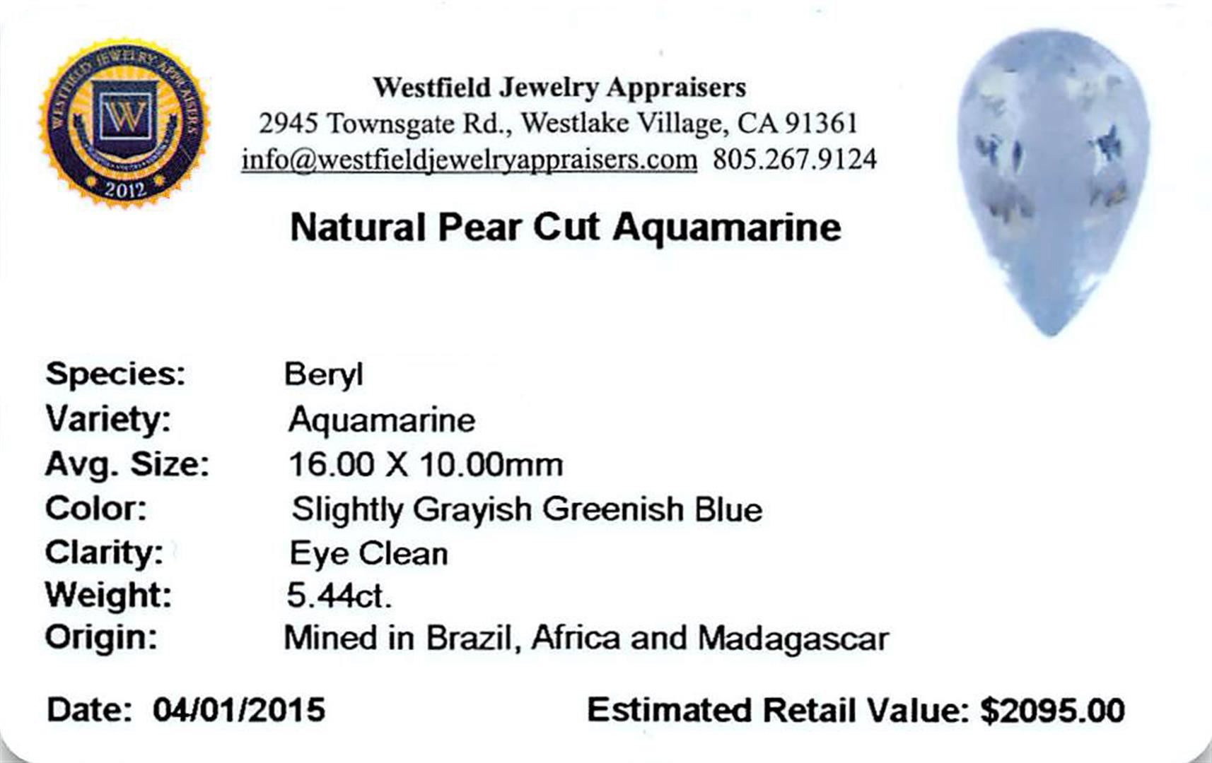 One pear cut natural aquamarine exact weight 5.44ct., clarity is eye clean, type I, medium, slightly grayish, very slightly greenish blue color, (GIA vslgB 5/2), cut is good. Westfield Appraised at $2,095.00.