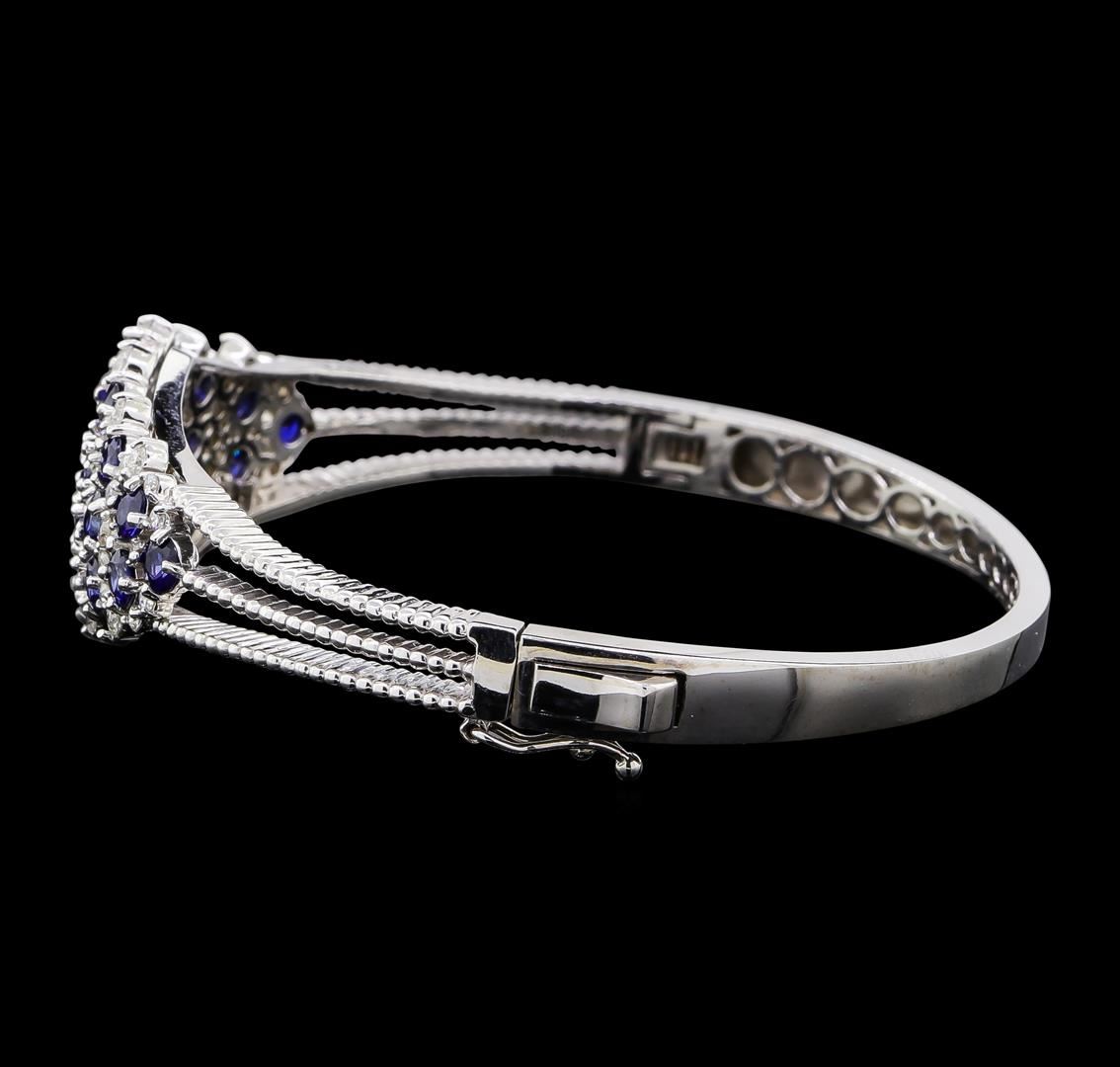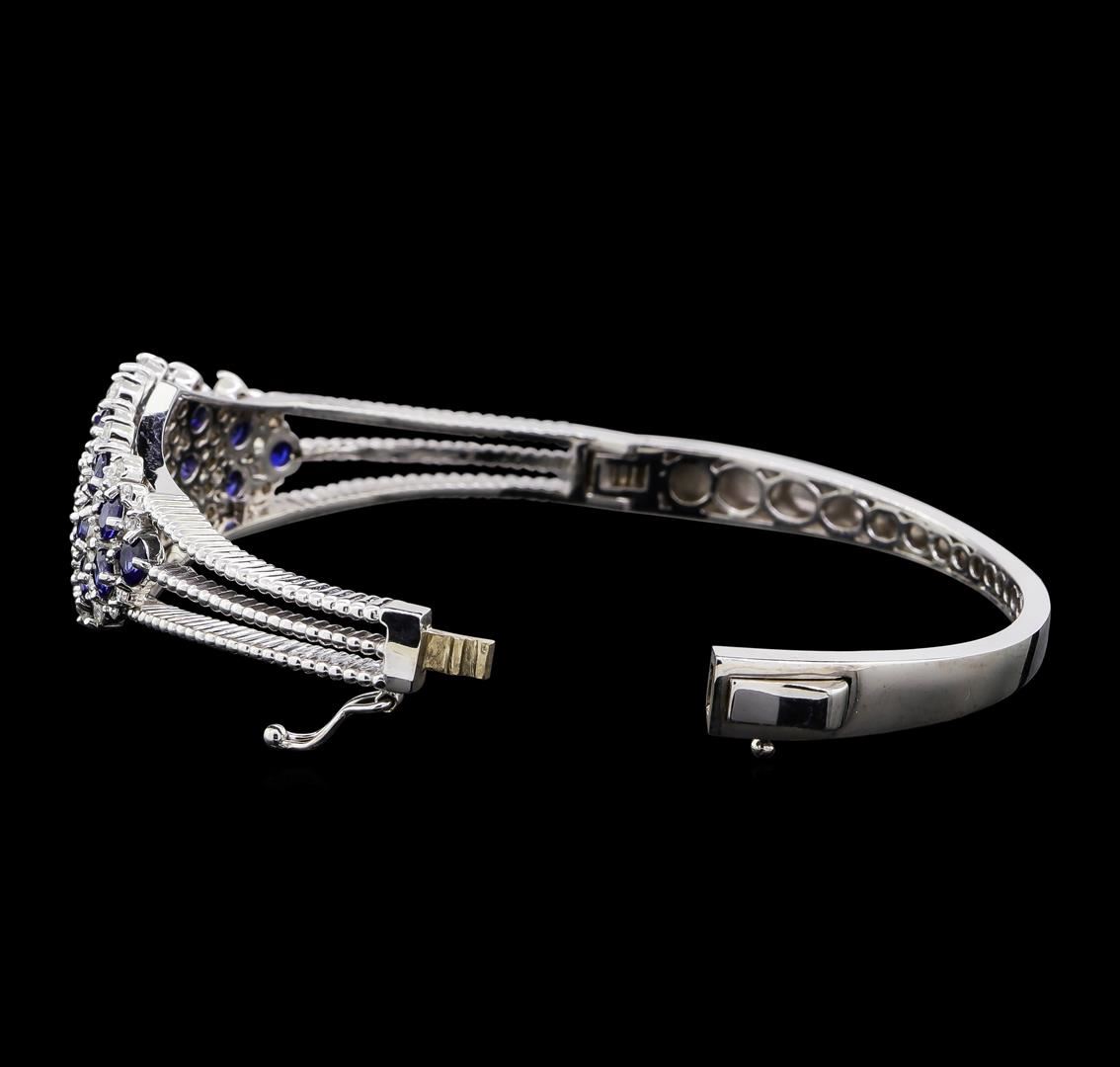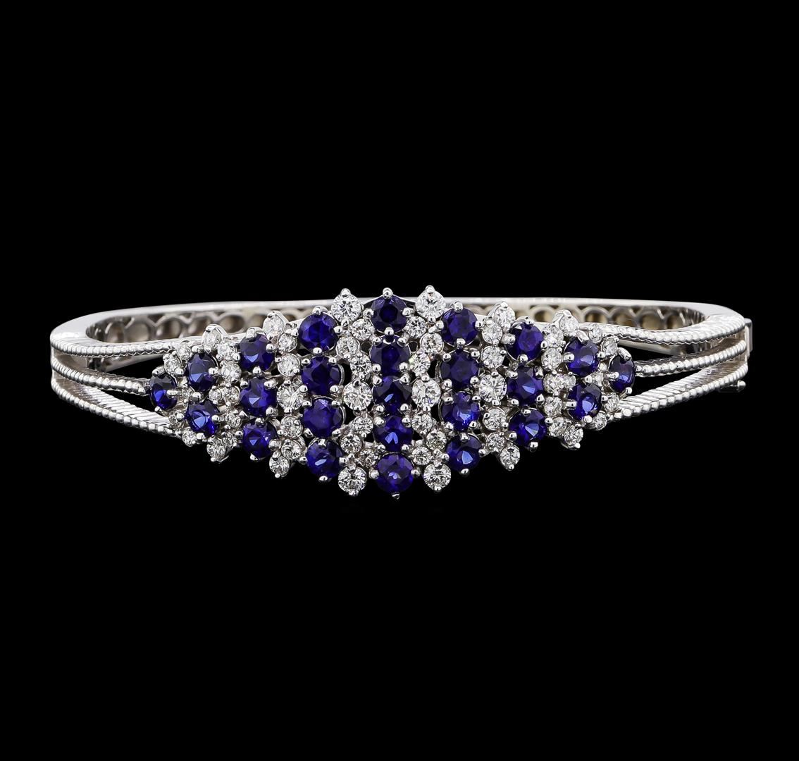One electronically tested 14KT white gold lady's combination cast & assembled fashion bangle bracelet with a tongue clasp with foldover safety with a bright polish finish. The featured lady's bracelet measures approximately 7.5 inches in length. Identified with markings of 'K14'. Condition is new, good workmanship. Containing: Twenty-five prong set round modified brilliant cut natural blue sapphires, measuring 3.30 - 3.25 x 2.20 mm, (depth est.) approximate total weight of 4.94ct., clarity is eye clean, medium dark, strong, blue color, (GIA B 6/5), cut is very good. Transmitting light with no distortion, transparent. Colored gemstones are presumed to have been subjected to commonly used enhancement processes. Graded in the setting. Eight prong set round brilliant cut diamonds, measuring 2.60 - 2.50 x 1.58mm (depth est.) approximate total weight of 8 Stones = 0.50ct. Graded in the setting. Clarity SI-1 to SI-2. Color: H - I Cut Good Forty-Six prong set round brilliant cut diamonds, measuring 2.00 - 1.80 x 1.16mm (depth est.) approximate total weight of 46 Stones = 1.18ct. Graded in the setting. Clarity SI-1 to I-1. Color: H - I Cut Good Four prong set round brilliant cut diamonds, measuring 1.30 - 1.25 x 0.77mm (depth est.) approximate total weight of 4 Stones = 0.03ct. Graded in the setting. Clarity SI-1 to I-1. Color: H - I Cut Good. Total Weight of Colored Stones 4.94ct.. Total Weight of Diamonds 1.71ct.. Total Weight of Bangle Bracelet 24.70gm. GAS Appraised at $9,315.00.