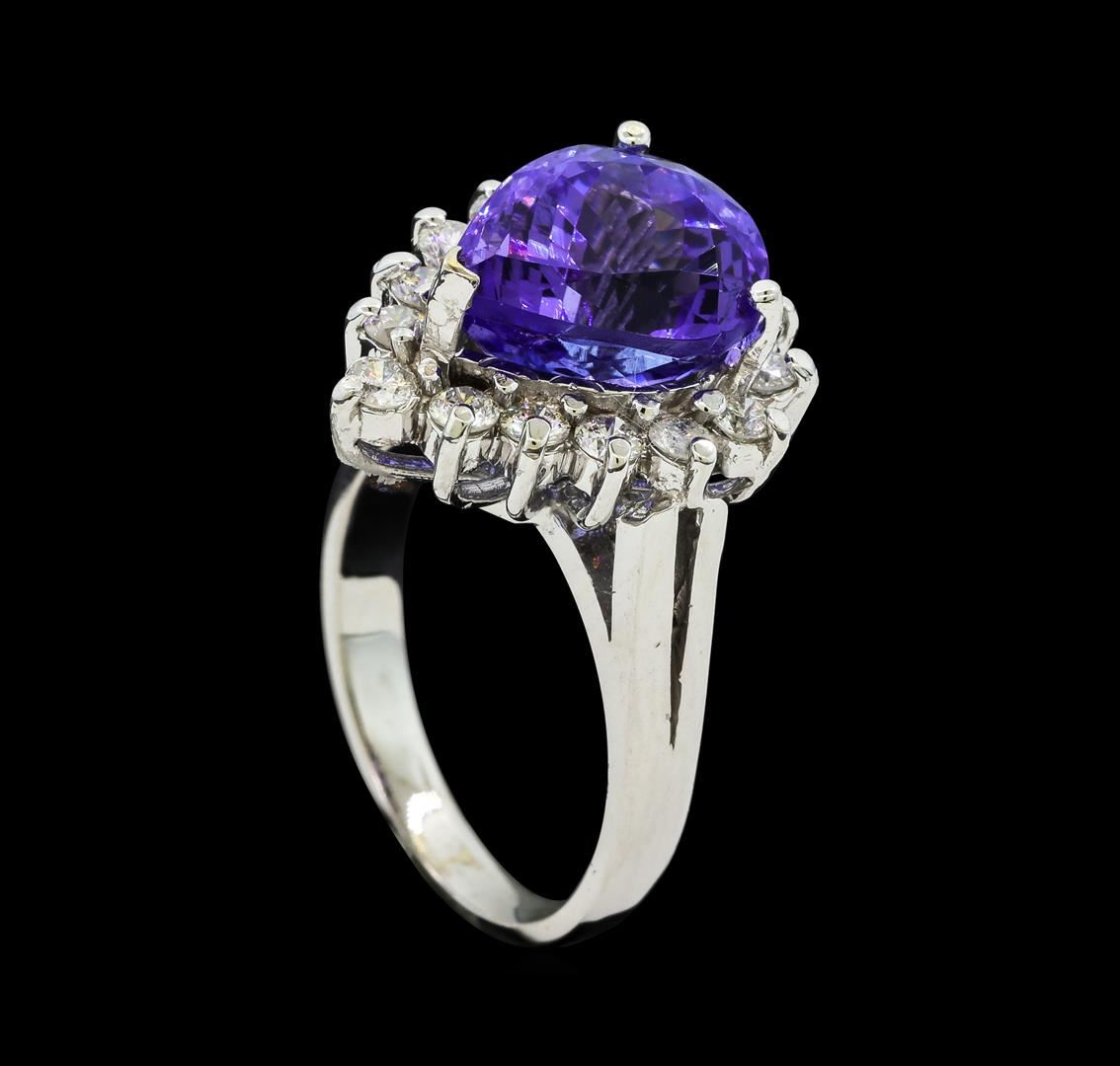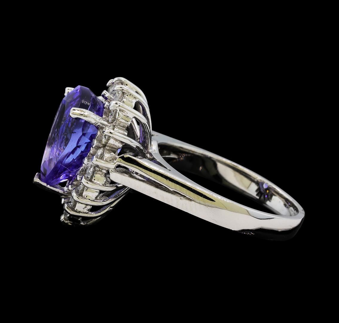 One electronically tested 14KT white gold lady's cast fashion ring with a basket halo with a bright polish finish. The featured lady's ring has a shank measuring 2.60 millimeters wide. Identified with markings of '14K'. Condition is new, good workmanship. Containing: One prong set pear modified brilliant cut natural tanzanite, measuring 11.74 x 9.77 x 7.63mm, (depth est.) approximate weight of 5.44ct., clarity is eye clean, medium dark, moderately strong, violet color, (GIA V 6/4), cut is very good. Transmitting light with no distortion, transparent. Colored gemstones are presumed to have been subjected to commonly used enhancement processes. Graded in the setting. Fifteen prong set round brilliant cut diamonds, measuring 2.40 - 2.35 x 1.45mm (depth est.) approximate total weight of 15 Stones = 0.75ct. Graded in the setting. Clarity SI-1 to I-1. Color: G - H Cut Good. Total Weight of Colored Stones 5.44ct.. Total Weight of Diamonds 0.75ct.. Total Weight of Ring 7.00gm. GAS Appraised at $11,390.00.