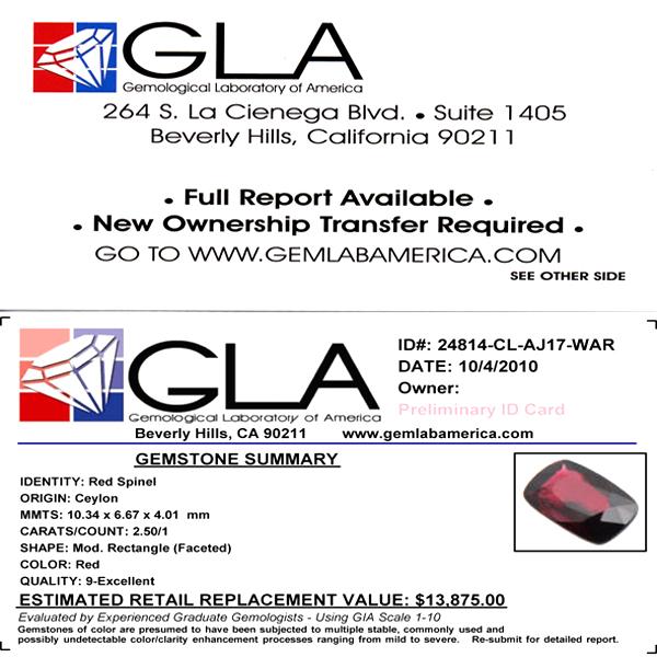 Excellent red colored specimen cushion cut; lab quality evaluation 9; treatment as noted; Gem Guide wholesale $2176-$3808; full retail appraisal $13875; full lab evaluation available
