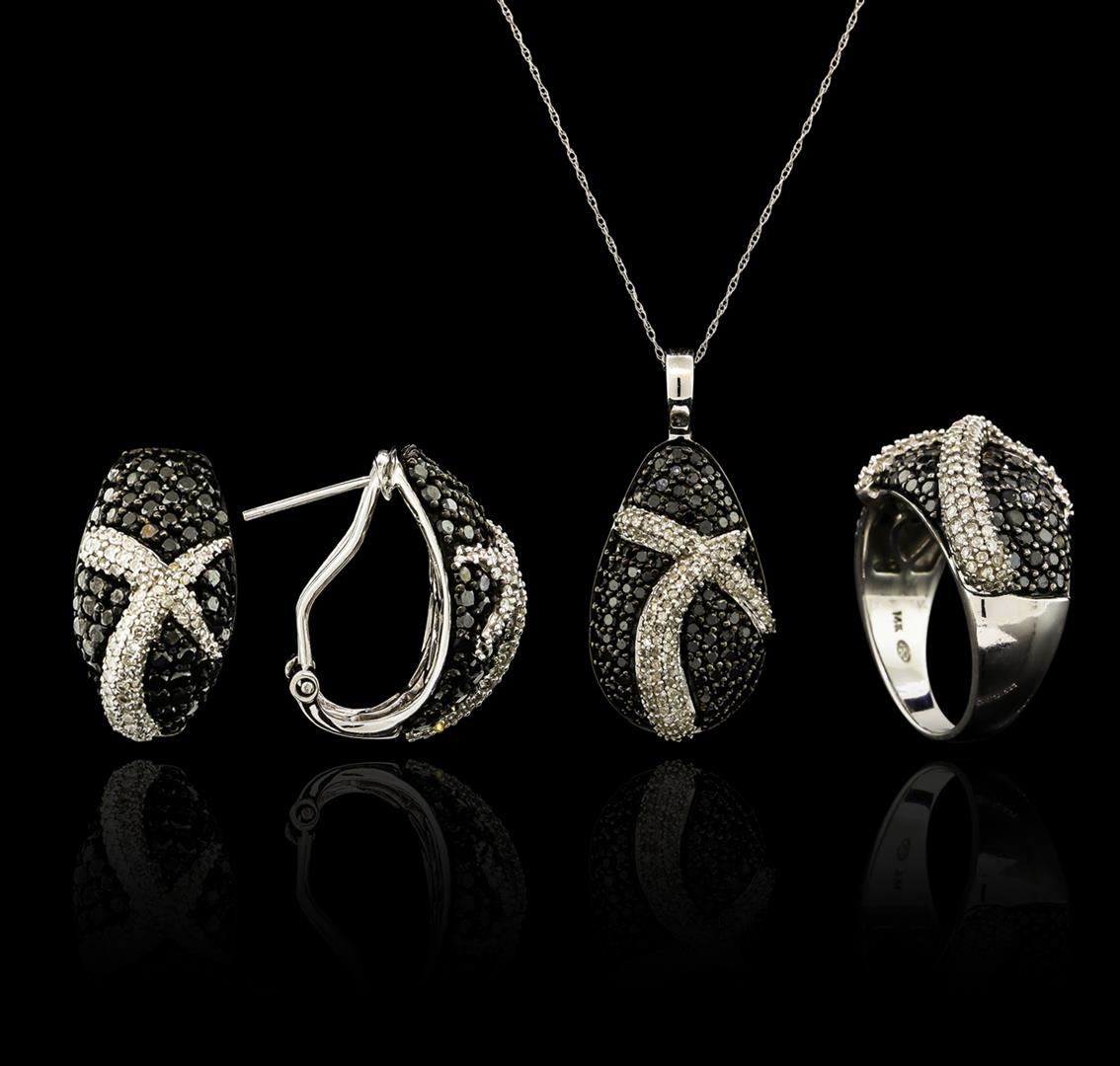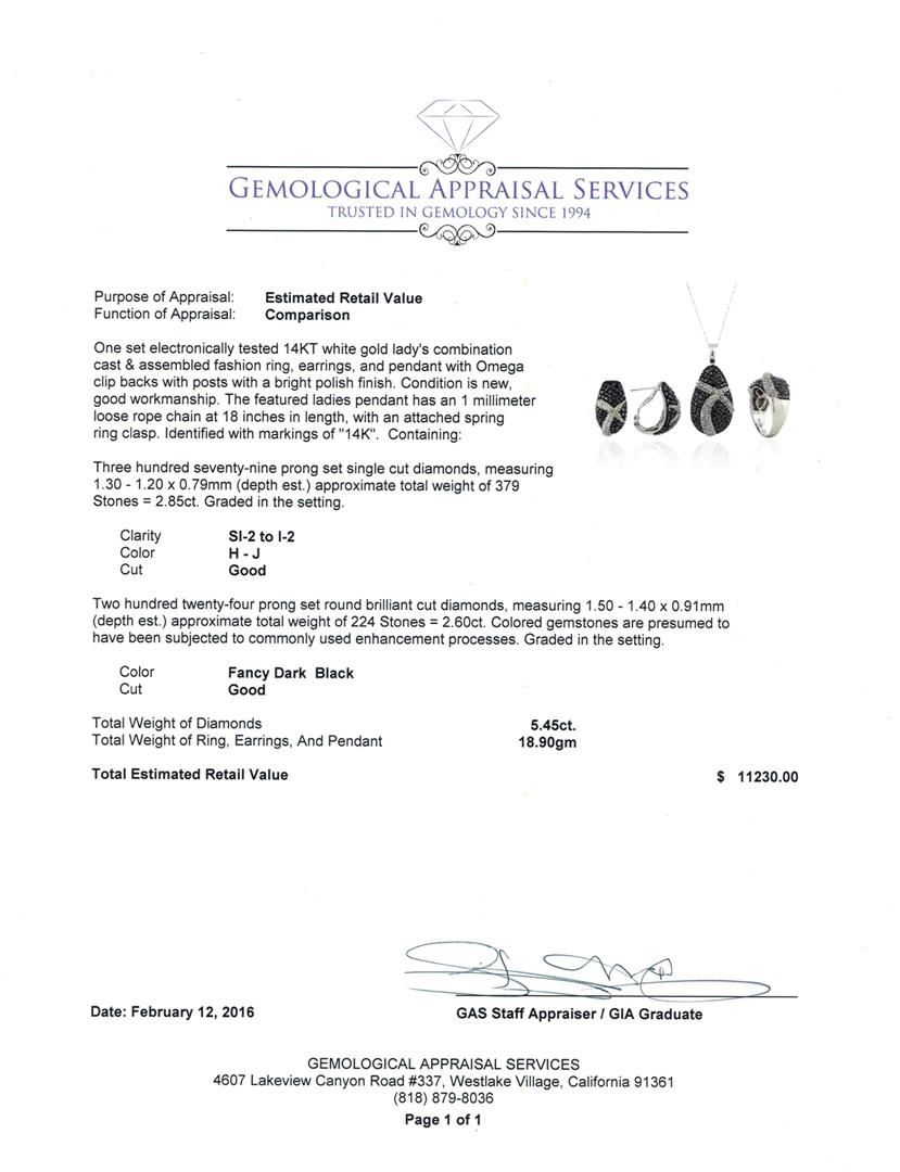 One set electronically tested 14KT white gold lady's combination cast & assembled fashion ring, earrings, and pendant with Omega clip backs with posts with a bright polish finish. The featured ladies pendant has an 1 millimeter loose rope chain at 18 inches in length, with an attached spring ring clasp. Identified with markings of "14K". Condition is new, good workmanship. Containing: Three Hundred Seventy-Nine prong set single cut diamonds, measuring 1.30 - 1.20 x 0.79mm (depth est.) approximate total weight of 379 Stones = 2.85ct. Graded in the setting. Clarity: SI-2 to I-2. Color: H - Good Two Hundred Twenty-Four prong set round brilliant cut diamonds, measuring 1.50 - 1.40 x 0.91mm (depth est.) approximate total weight of 224 Stones = 2.60ct. Colored gemstones are presumed to have been subjected to commonly used enhancement processes. Graded in the setting. Cut Good. Total Weight of Diamonds 5.45ct. Total Weight of Ring, Earrings, And Pendant 18.90gm. GAS Appraised at $11,230.00.