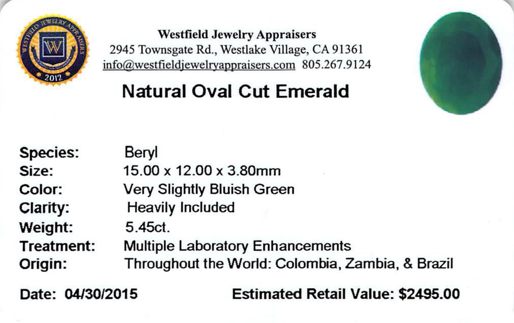 One oval cut natural emerald, measuring 15.00 x 12.00 x 3.80mm, exact weight 5.45ct., clarity is heavily included, type III, medium dark, very slightly grayish, very slightly bluish green color, (GIA vslbG 6/3), cut is good. Westfield Appraised at $2,495.00.