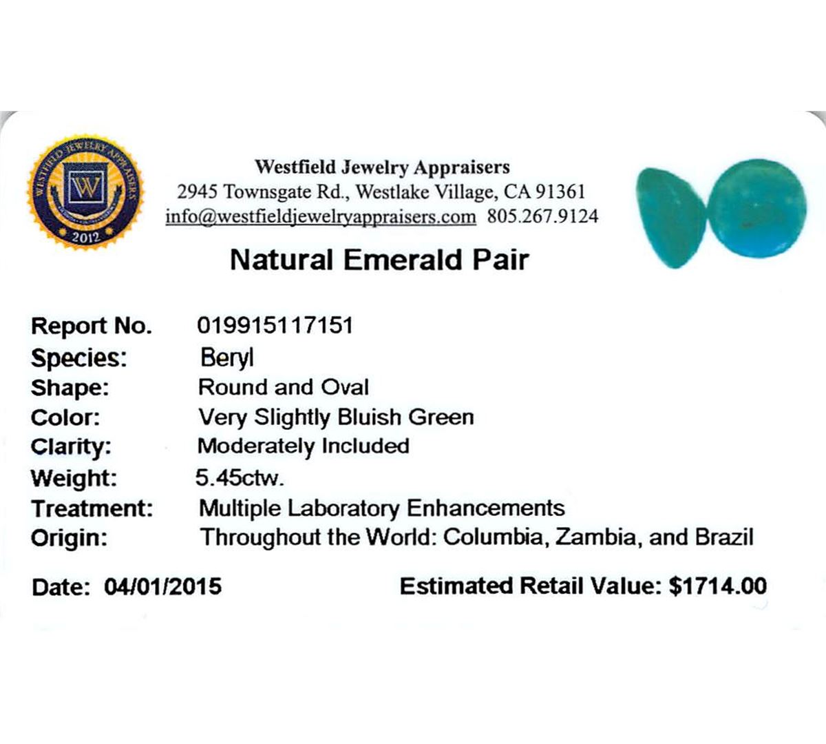 Two oval and round mixed cut natural emeralds exact total weight 5.45ct., clarity is moderately included, type III, medium dark, very slightly grayish, very slightly bluish green color, (GIA vslbG 6/3), cut is good. Westfield Appraised at $1,740.00.