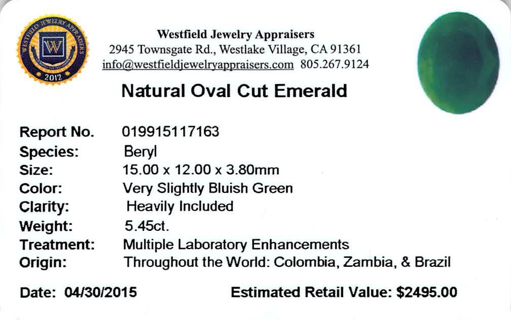 One oval cut natural emerald, measuring 15.00 x 12.00 x 3.80mm, exact weight 5.45ct., clarity is heavily included, type III, medium dark, very slightly grayish, very slightly bluish green color, (GIA vslbG 6/3), cut is good. Westfield Appraised at $2,495.00.