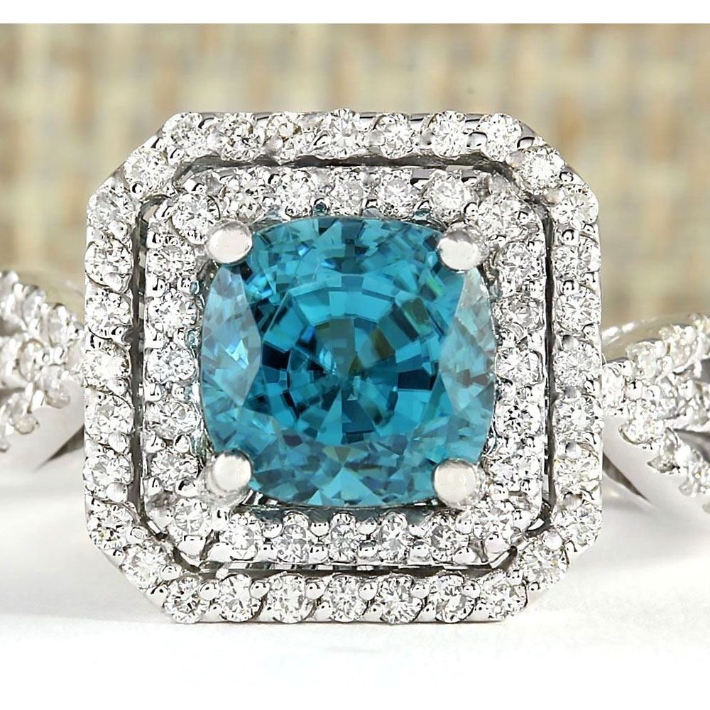 5.46 CTW Natural Blue Zircon And Diamond Ring 18K Solid White Gold
