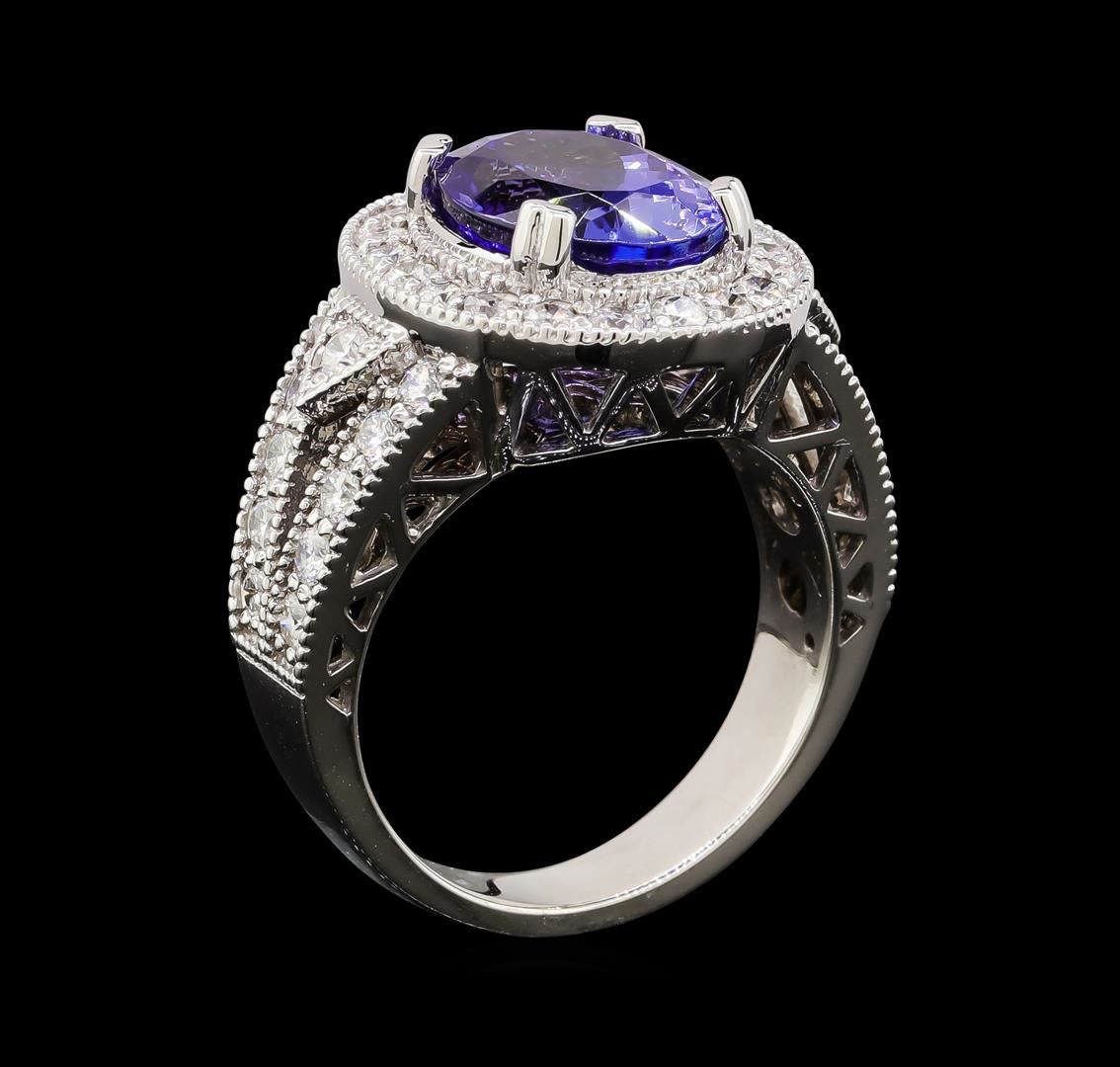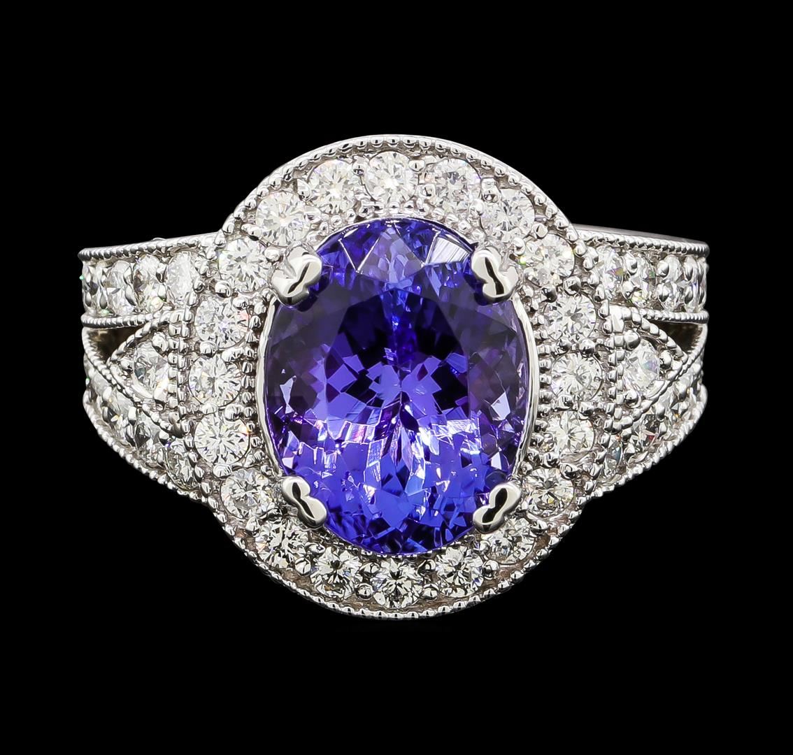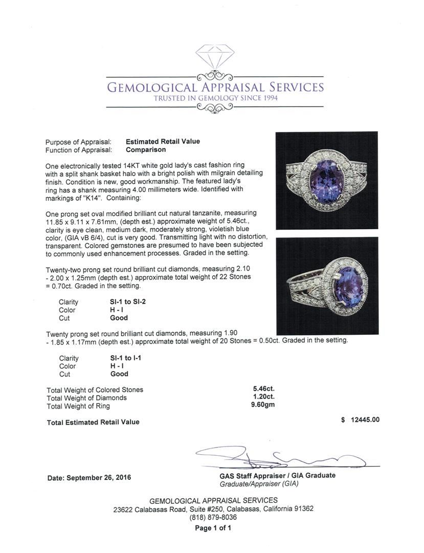 One electronically tested 14KT white gold lady's cast fashion ring with a split shank basket halo with a bright polish with milgrain detailing finish. The featured lady's ring has a shank measuring 4.00 millimeters wide. Identified with markings of 'K14'. Condition is new, good workmanship. Containing: One prong set oval modified brilliant cut natural tanzanite, measuring 11.85 x 9.11 x 7.61mm, (depth est.) approximate weight of 5.46ct., clarity is eye clean, medium dark, moderately strong, violetish blue color, (GIA vB 6/4), cut is very good. Transmitting light with no distortion, transparent. Colored gemstones are presumed to have been subjected to commonly used enhancement processes. Graded in the setting. Twenty-Two prong set round brilliant cut diamonds, measuring 2.10 - 2.00 x 1.25mm (depth est.) approximate total weight of 22 Stones = 0.70ct. Graded in the setting. Clarity SI-1 to SI-2. Color: H - I Cut Good Twenty prong set round brilliant cut diamonds, measuring 1.90 - 1.85 x 1.17mm (depth est.) approximate total weight of 20 Stones = 0.50ct. Graded in the setting. Clarity SI-1 to I-1. Color: H - I Cut Good. Total Weight of Colored Stones 5.46ct.. Total Weight of Diamonds 1.20ct.. Total Weight of Ring 9.60gm. GAS Appraised at $12,445.00.
