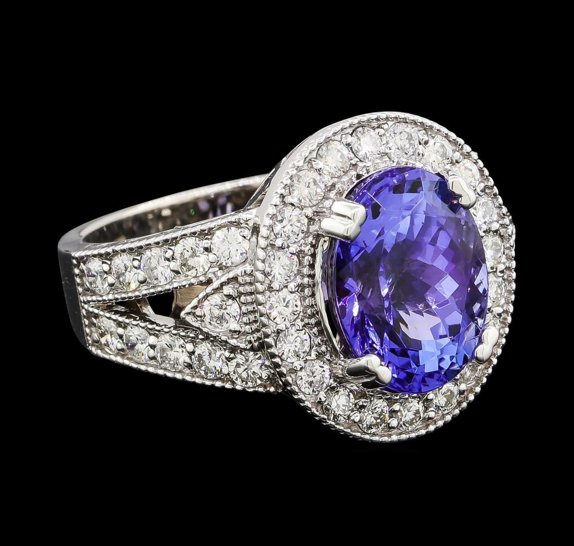 One electronically tested 14KT white gold lady's cast fashion ring with a split shank basket halo with a bright polish with milgrain detailing finish. The featured lady's ring has a shank measuring 4.00 millimeters wide. Identified with markings of 'K14'. Condition is new, good workmanship. Containing: One prong set oval modified brilliant cut natural tanzanite, measuring 11.85 x 9.11 x 7.61mm, (depth est.) approximate weight of 5.46ct., clarity is eye clean, medium dark, moderately strong, violetish blue color, (GIA vB 6/4), cut is very good. Transmitting light with no distortion, transparent. Colored gemstones are presumed to have been subjected to commonly used enhancement processes. Graded in the setting. Twenty-Two prong set round brilliant cut diamonds, measuring 2.10 - 2.00 x 1.25mm (depth est.) approximate total weight of 22 Stones = 0.70ct. Graded in the setting. Clarity SI-1 to SI-2. Color: H - I Cut Good Twenty prong set round brilliant cut diamonds, measuring 1.90 - 1.85 x 1.17mm (depth est.) approximate total weight of 20 Stones = 0.50ct. Graded in the setting. Clarity SI-1 to I-1. Color: H - I Cut Good. Total Weight of Colored Stones 5.46ct.. Total Weight of Diamonds 1.20ct.. Total Weight of Ring 9.60gm. GAS Appraised at $12,445.00.