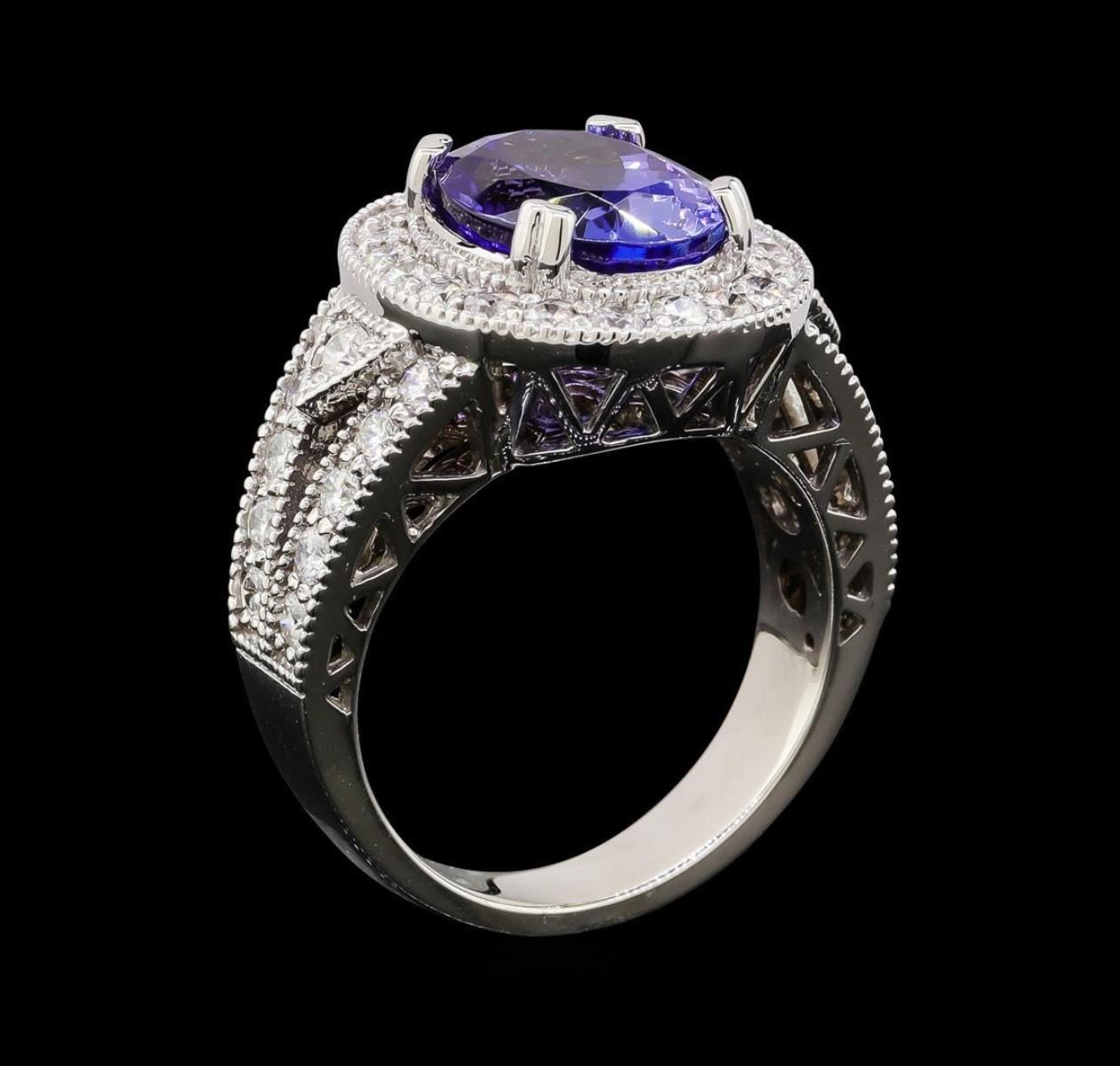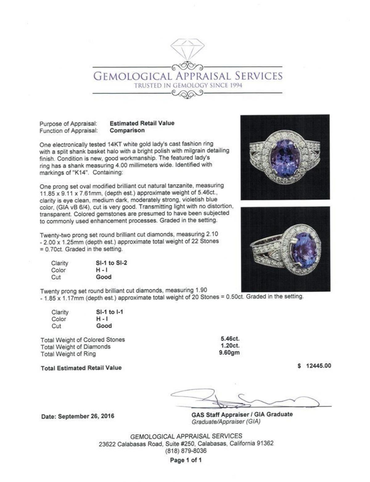 One electronically tested 14KT white gold lady's cast fashion ring with a split shank basket halo with a bright polish with milgrain detailing finish. The featured lady's ring has a shank measuring 4.00 millimeters wide. Identified with markings of 'K14'. Condition is new, good workmanship. Containing: One prong set oval modified brilliant cut natural tanzanite, measuring 11.85 x 9.11 x 7.61mm, (depth est.) approximate weight of 5.46ct., clarity is eye clean, medium dark, moderately strong, violetish blue color, (GIA vB 6/4), cut is very good. Transmitting light with no distortion, transparent. Colored gemstones are presumed to have been subjected to commonly used enhancement processes. Graded in the setting. Twenty-Two prong set round brilliant cut diamonds, measuring 2.10 - 2.00 x 1.25mm (depth est.) approximate total weight of 22 Stones = 0.70ct. Graded in the setting. Clarity SI-1 to SI-2. Color: H - I Cut Good Twenty prong set round brilliant cut diamonds, measuring 1.90 - 1.85 x 1.17mm (depth est.) approximate total weight of 20 Stones = 0.50ct. Graded in the setting. Clarity SI-1 to I-1. Color: H - I Cut Good. Total Weight of Colored Stones 5.46ct.. Total Weight of Diamonds 1.20ct.. Total Weight of Ring 9.60gm. GAS Appraised.