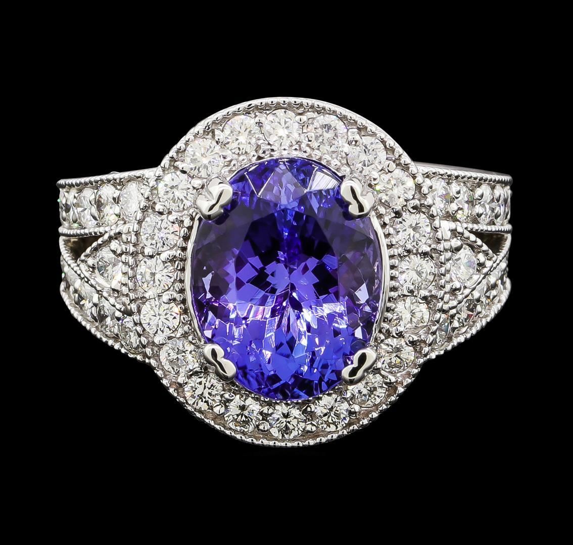 One electronically tested 14KT white gold lady's cast fashion ring with a split shank basket halo with a bright polish with milgrain detailing finish. The featured lady's ring has a shank measuring 4.00 millimeters wide. Identified with markings of 'K14'. Condition is new, good workmanship. Containing: One prong set oval modified brilliant cut natural tanzanite, measuring 11.85 x 9.11 x 7.61mm, (depth est.) approximate weight of 5.46ct., clarity is eye clean, medium dark, moderately strong, violetish blue color, (GIA vB 6/4), cut is very good. Transmitting light with no distortion, transparent. Colored gemstones are presumed to have been subjected to commonly used enhancement processes. Graded in the setting. Twenty-Two prong set round brilliant cut diamonds, measuring 2.10 - 2.00 x 1.25mm (depth est.) approximate total weight of 22 Stones = 0.70ct. Graded in the setting. Clarity SI-1 to SI-2. Color: H - I Cut Good Twenty prong set round brilliant cut diamonds, measuring 1.90 - 1.85 x 1.17mm (depth est.) approximate total weight of 20 Stones = 0.50ct. Graded in the setting. Clarity SI-1 to I-1. Color: H - I Cut Good. Total Weight of Colored Stones 5.46ct.. Total Weight of Diamonds 1.20ct.. Total Weight of Ring 9.60gm. GAS Appraised.