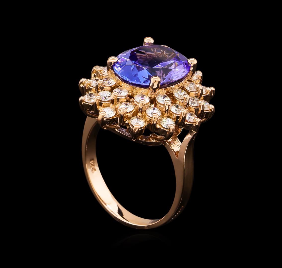 One electronically tested 14KT rose gold lady's cast fashion ring with a triple basket halo with a bright polish finish. The featured lady's ring has a shank measuring 2.65 millimeters wide. Identified with markings of "K14". Condition is new, good workmanship. Containing: One prong set oval modified brilliant cut natural tanzanite, measuring 12.85 x 10.40 x 6.00mm, approximate weight of 5.47ct., clarity is eye clean, type I, medium, moderately strong, bluish violet color, (GIA bV 5/4), cut is very good. Transmitting light with no distortion, transparent. Colored gemstones are presumed to have been subjected to commonly used enhancement processes. Graded in the setting. Thirty-Six prong set round brilliant cut diamonds, measuring 2.30 - 2.20 x 1.35mm (depth est.) approximate total weight of 36 Stones = 1.51ct. Graded in the setting. Clarity: VS-2 to SI-1. Color: H - I. Cut Very Good. Total Weight of Colored Stones 5.47ct. Total Weight of Diamonds 1.51ct. Total Weight of Ring 8.60gm. GAS Appraised at $13,710.00.