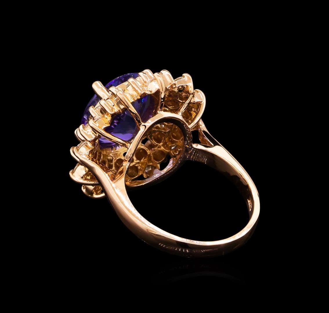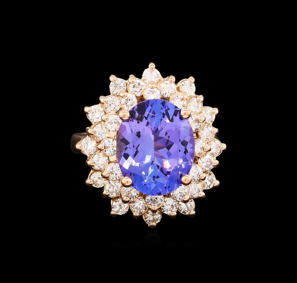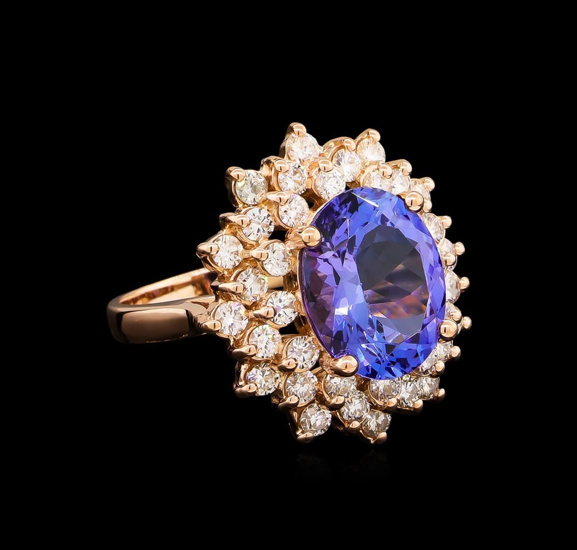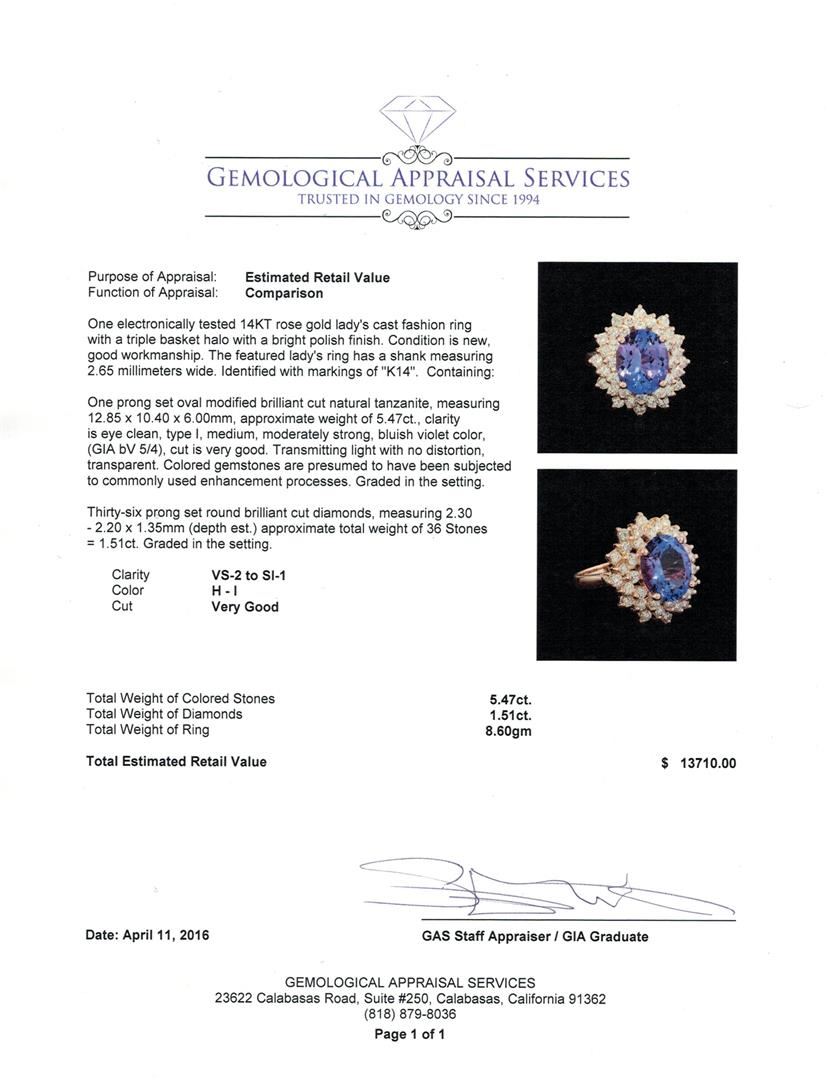 One electronically tested 14KT rose gold lady's cast fashion ring with a triple basket halo with a bright polish finish. The featured lady's ring has a shank measuring 2.65 millimeters wide. Identified with markings of "K14". Condition is new, good workmanship. Containing: One prong set oval modified brilliant cut natural tanzanite, measuring 12.85 x 10.40 x 6.00mm, approximate weight of 5.47ct., clarity is eye clean, type I, medium, moderately strong, bluish violet color, (GIA bV 5/4), cut is very good. Transmitting light with no distortion, transparent. Colored gemstones are presumed to have been subjected to commonly used enhancement processes. Graded in the setting. Thirty-Six prong set round brilliant cut diamonds, measuring 2.30 - 2.20 x 1.35mm (depth est.) approximate total weight of 36 Stones = 1.51ct. Graded in the setting. Clarity: VS-2 to SI-1. Color: H - I. Cut Very Good. Total Weight of Colored Stones 5.47ct. Total Weight of Diamonds 1.51ct. Total Weight of Ring 8.60gm. GAS Appraised at $13,710.00.
