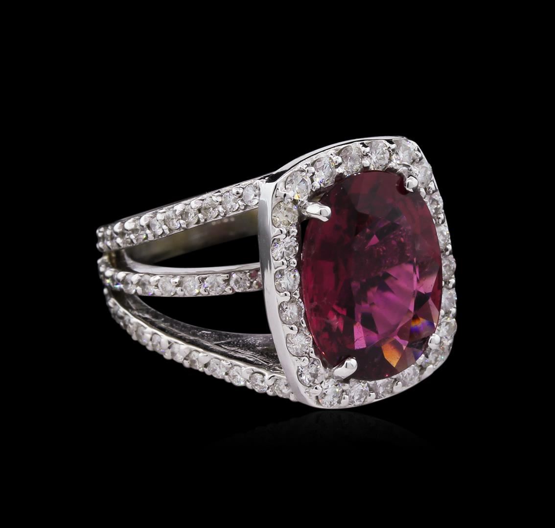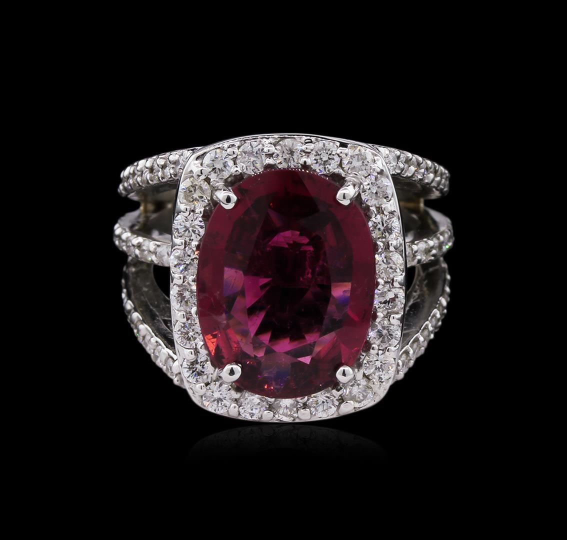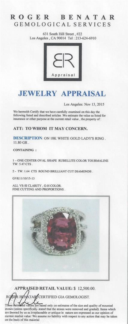 One 18KT White Gold lady's ring. 11.80 GR. Containing: one center oval shape rubellite color tourmaline TW: 5.47 CTS. TW: 1.64 CTS round brilliant cut diamonds. All VS-SI Clarity, G-H Color Fine Cutting and Proportions. RBGS Appraised at $12,500.00.