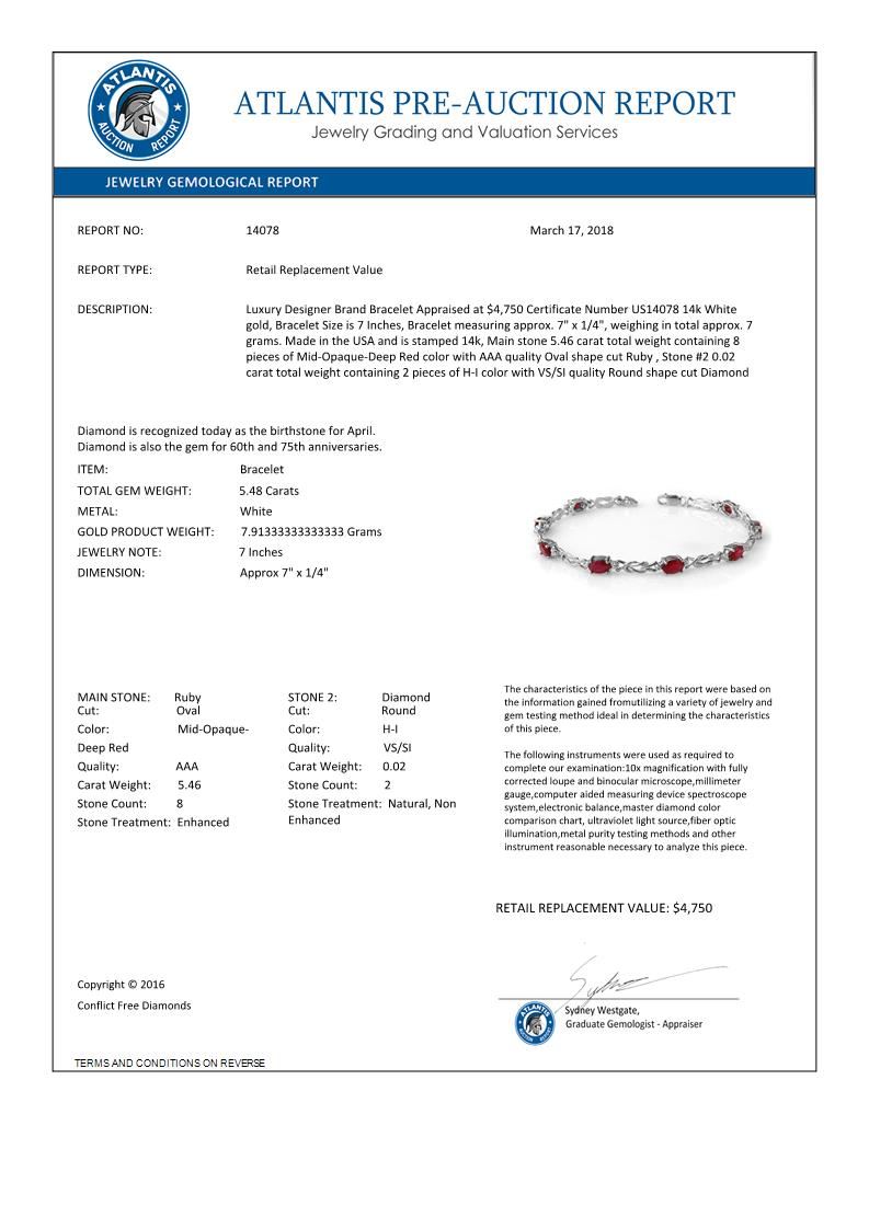 REF-66X4T -14078 ---- 5.48 CTW Ruby & Diamond Bracelet 14K White Gold ---- Luxury Designer Brand Bracelet Appraised at $4,750 Certificate Number US14078 14k White gold, Bracelet Size is 7 Inches, Bracelet measuring approx. 7" x 1/4", weighing in total approx. 7 grams. Made in the USA and is stamped 14k, Main stone 5.46 carat total weight containing 8 pieces of Mid-Opaque-Deep Red color with AAA quality Oval shape cut Ruby , Stone #2 0.02 carat total weight containing 2 pieces of H-I color with VS/SI quality Round shape cut Diamond