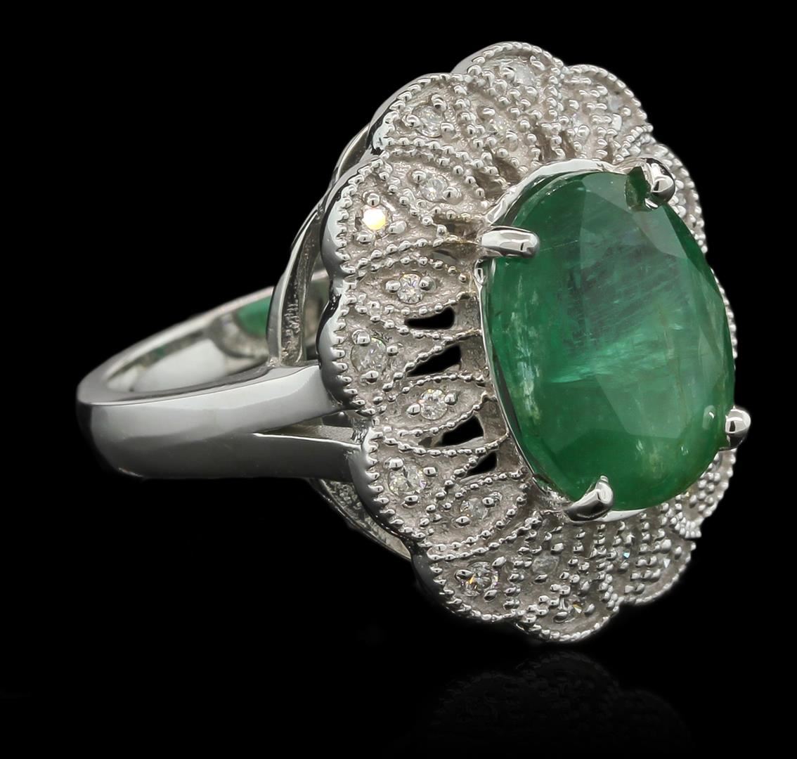 One electronically tested 14KT white gold lady's cast fashion ring with a split shank with a bright polish with milgrain detailing finish. The featured lady's ring has a scalloped halo motif with a 2.75 millimeter wide shank. Identified with markings of "K14". Condition is new, good workmanship. Containing: Twelve prong set round brilliant cut diamonds, measuring 1.20 - 1.15 x 0.77mm (depth est.) approximate total weight of 12 Stones = 0.08ct. Graded in the setting. Clarity: SI-2 to I-1. Color: G - H. Cut Good Twelve prong set round brilliant cut diamonds, measuring 1.50 - 1.40 x 0.94mm (depth est.) approximate total weight of 12 Stones = 0.16ct. Graded in the setting. Clarity: SI-1 to I-1. Color: H - I. Cut Good One prong set oval mixed cut natural emerald, measuring 12.77 x 10.83 x 7.04mm, approximate weight of 5.48ct., clarity is heavily included, type III, medium dark, moderately strong, green color, (GIA G 6/4), cut is good. Colored gemstones are presumed to have been subjected to commonly used enhancement processes. Graded in the setting. Total Weight of Colored Stones 5.48ct. Total Weight of Diamonds 0.24ct. Total Weight of Ring 9.40gm. GAS Appraised at $10,065.00.