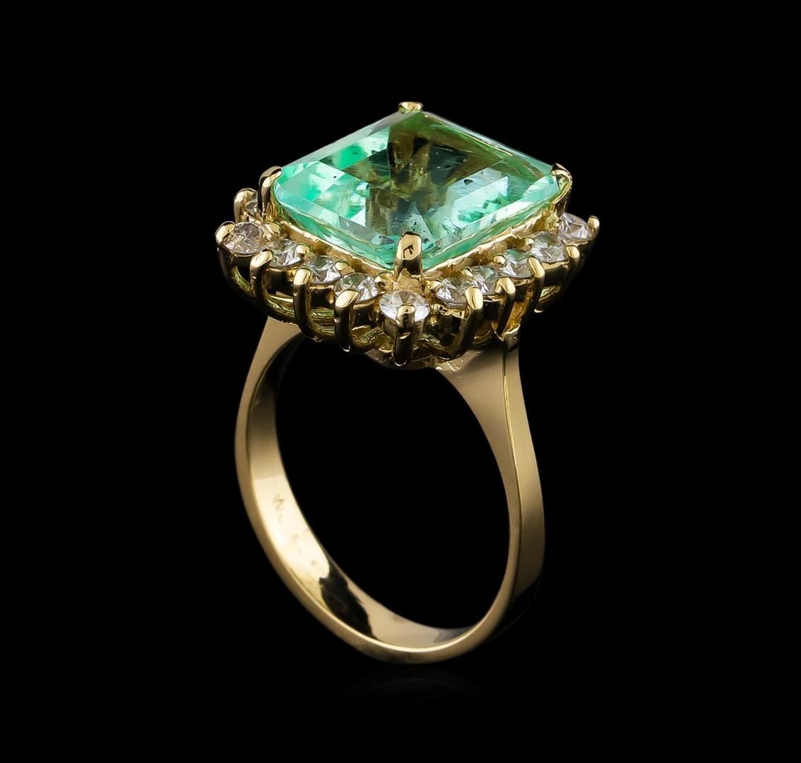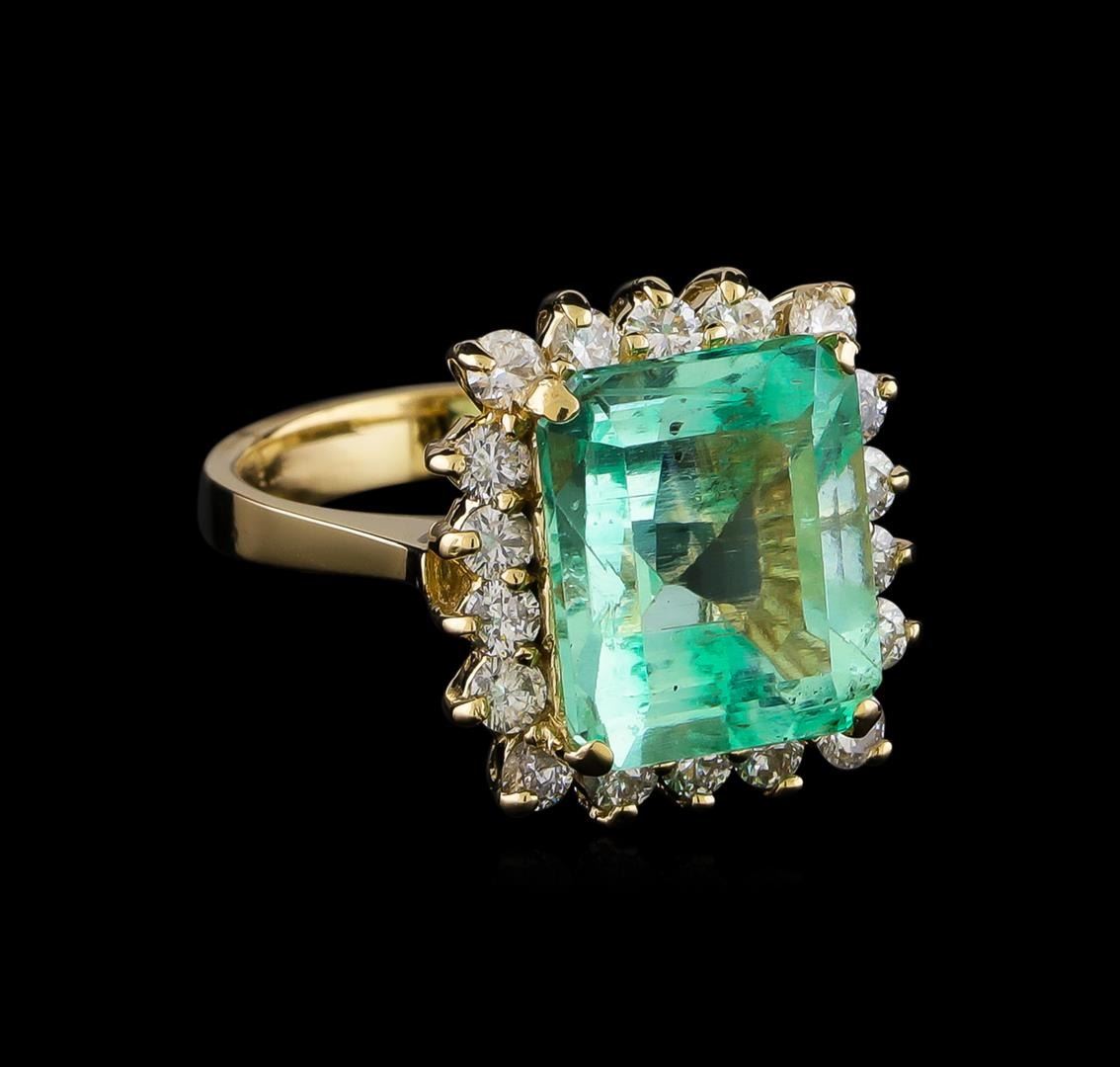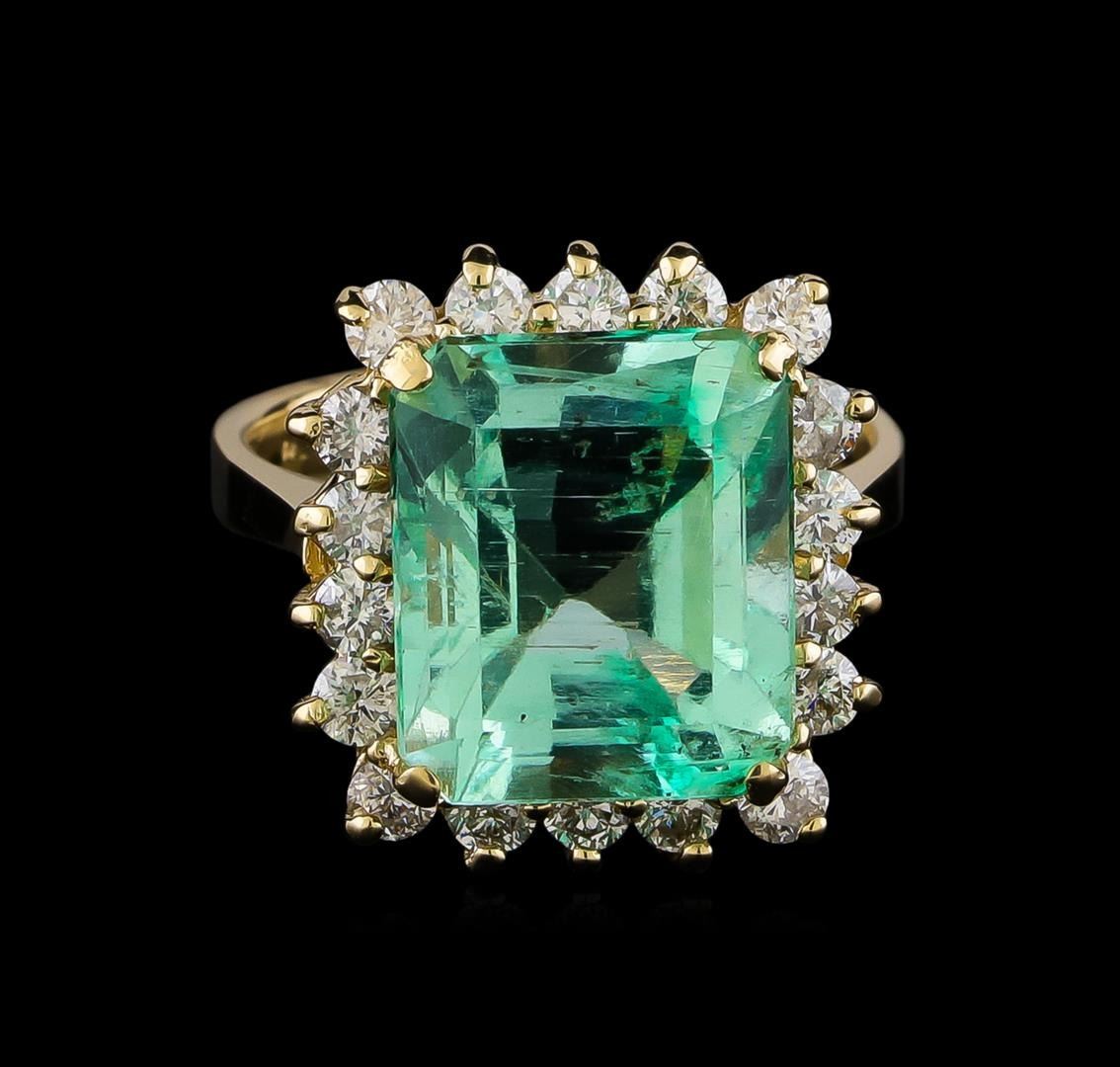 One electronically tested 14KT yellow gold lady's cast fashion ring with a basket halo with a bright polish finish. The featured lady's ring has a shank measuring 2.87 millimeters in width. Identified with markings of "14K". Condition is new, good workmanship. Containing: One prong set emerald step cut natural emerald, measuring 12.00 x 10.16 x 6.85mm, (depth est.) approximate weight of 5.48ct., clarity is slightly included, light, moderately strong, green color, (GIA G 3/4), cut is good. Transmitting light somewhat diffusely, transparent to translucent. Colored gemstones are presumed to have been subjected to commonly used enhancement processes. Indications of oil residue. Graded in the setting. Eighteen prong set round brilliant cut diamonds, measuring 2.40 - 2.30 x 1.48mm (depth est.) approximate total weight of 18 Stones = 0.90ct. Graded in the setting. Clarity: VS-2 to SI-2. Color: H - I. Cut Good. Total Weight of Colored Stones 5.48ct. Total Weight of Diamonds 0.90ct. Total Weight of Ring 6.50gm. GAS Appraised at $7,840.00.