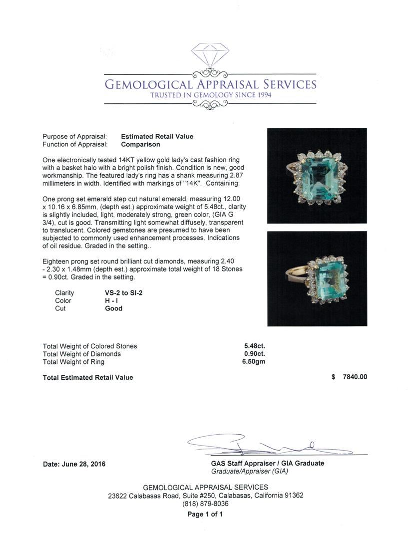 One electronically tested 14KT yellow gold lady's cast fashion ring with a basket halo with a bright polish finish. The featured lady's ring has a shank measuring 2.87 millimeters in width. Identified with markings of "14K". Condition is new, good workmanship. Containing: One prong set emerald step cut natural emerald, measuring 12.00 x 10.16 x 6.85mm, (depth est.) approximate weight of 5.48ct., clarity is slightly included, light, moderately strong, green color, (GIA G 3/4), cut is good. Transmitting light somewhat diffusely, transparent to translucent. Colored gemstones are presumed to have been subjected to commonly used enhancement processes. Indications of oil residue. Graded in the setting. Eighteen prong set round brilliant cut diamonds, measuring 2.40 - 2.30 x 1.48mm (depth est.) approximate total weight of 18 Stones = 0.90ct. Graded in the setting. Clarity: VS-2 to SI-2. Color: H - I. Cut Good. Total Weight of Colored Stones 5.48ct. Total Weight of Diamonds 0.90ct. Total Weight of Ring 6.50gm. GAS Appraised at $7,840.00.