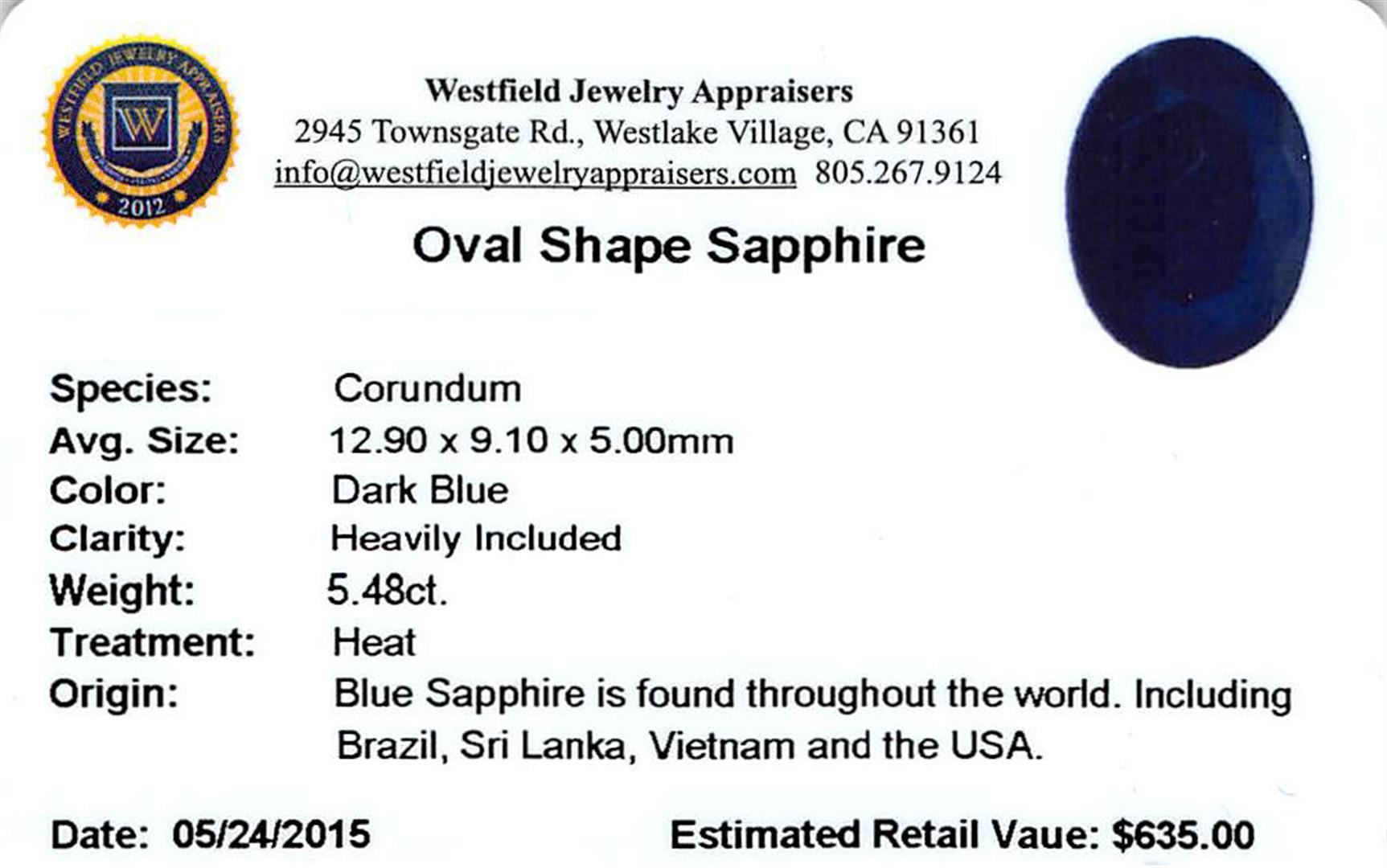 One oval mixed cut natural blue sapphire, measuring 12.70 x 9.10 x 5.00mm, approximate weight of 5.48ct., clarity is heavily included, type II, dark, very slightly grayish, blue color, (GIA B 7/3), cut is good. Transmitting light very diffusely, opaque. Naturally occurring internal & external characteristics are present. Indications of multiple laboratory enhancements, including high temperature heat treatment. Westfield Appraised at $635.00.