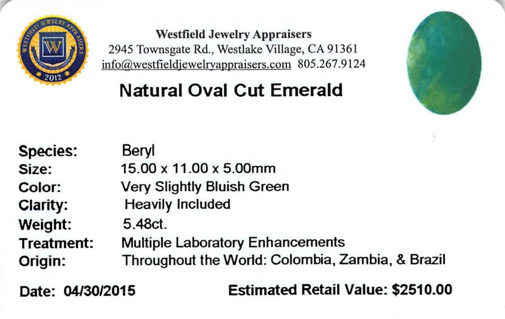 One oval cut natural emerald, measuring 15.00 x 11.00 x 5.00mm, exact weight 5.48ct., clarity is heavily included, type III, medium dark, very slightly grayish, very slightly bluish green color, (GIA vslbG 6/3), cut is good. Westfield Appraised at $2,510.00.