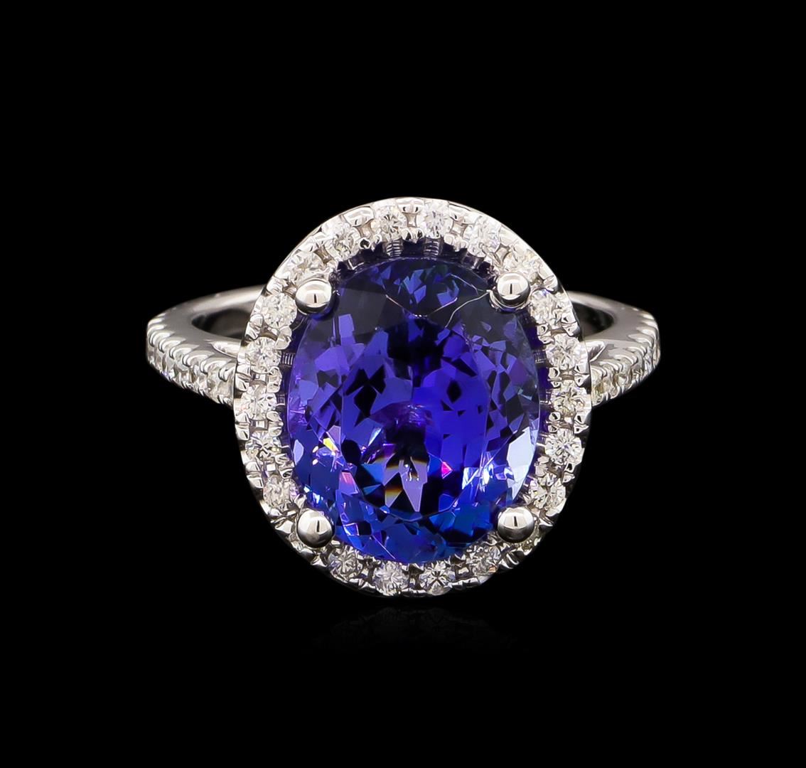 One electronically tested 14KT white gold lady's cast fashion ring with a cathedral shank with a halo with a bright polish finish. The featured lady's ring has a shank measuring 1.70 millimeters wide. Identified with markings of "14K". Condition is new, good workmanship. Containing: One prong set oval modified brilliant cut natural tanzanite, measuring 12.05 x 9.81 x 6.50mm, approximate weight of 5.48ct., clarity is eye clean, type I, medium, moderately strong, bluish violet color, (GIA bV 5/4), cut is very good. Transmitting light with no distortion, transparent. Colored gemstones are presumed to have been subjected to commonly used enhancement processes. Graded in the setting. Forty-Six prong set round brilliant cut diamonds, measuring 1.50 - 1.40 x 0.90mm (depth est.) approximate total weight of 46 Stones = 0.54ct. Graded in the setting. Clarity: SI-2 to I-1. Color: G - I. Cut Good. Total Weight of Colored Stones 5.48ct. Total Weight of Diamonds 0.54ct. Total Weight of Ring 5.50gm. GAS Appraised at $10,605.00.