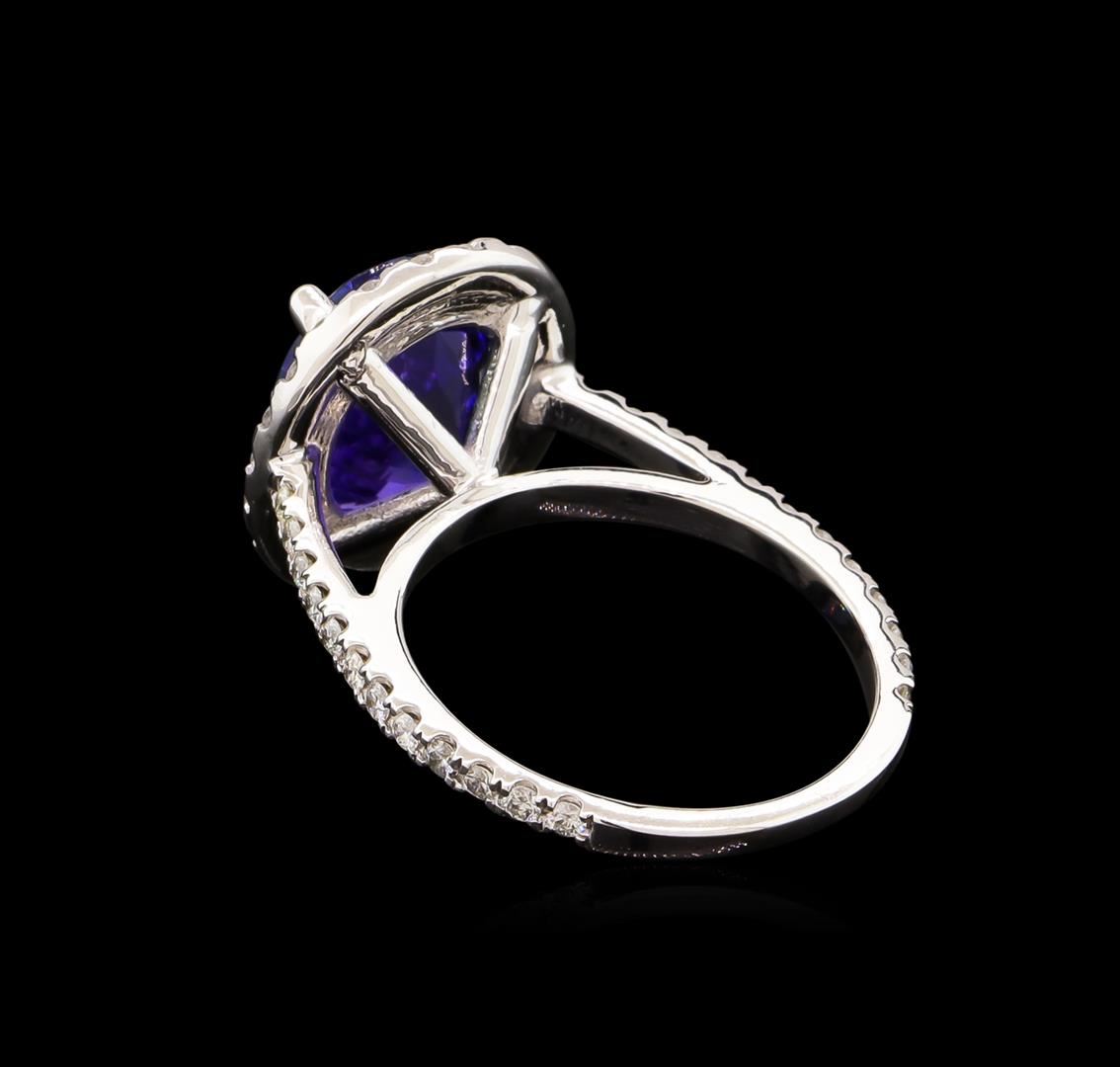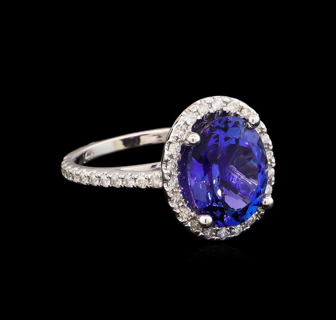 One electronically tested 14KT white gold lady's cast fashion ring with a cathedral shank with a halo with a bright polish finish. The featured lady's ring has a shank measuring 1.70 millimeters wide. Identified with markings of "14K". Condition is new, good workmanship. Containing: One prong set oval modified brilliant cut natural tanzanite, measuring 12.05 x 9.81 x 6.50mm, approximate weight of 5.48ct., clarity is eye clean, type I, medium, moderately strong, bluish violet color, (GIA bV 5/4), cut is very good. Transmitting light with no distortion, transparent. Colored gemstones are presumed to have been subjected to commonly used enhancement processes. Graded in the setting. Forty-Six prong set round brilliant cut diamonds, measuring 1.50 - 1.40 x 0.90mm (depth est.) approximate total weight of 46 Stones = 0.54ct. Graded in the setting. Clarity: SI-2 to I-1. Color: G - I. Cut Good. Total Weight of Colored Stones 5.48ct. Total Weight of Diamonds 0.54ct. Total Weight of Ring 5.50gm. GAS Appraised at $10,605.00.