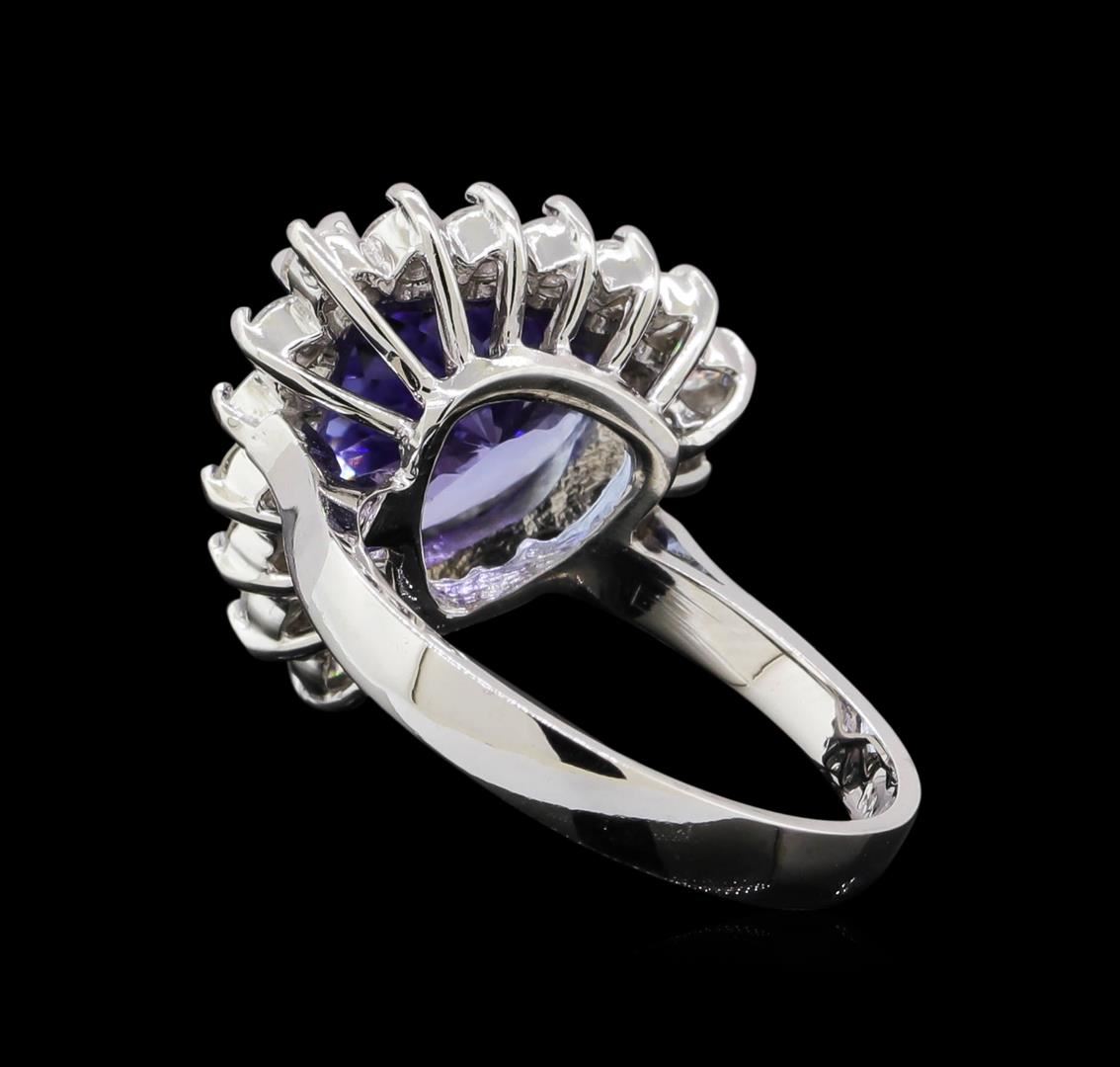One electronically tested 14KT white gold lady's cast fashion ring with a cathedral basket halo with a bright polish finish. The featured lady's ring has a shank measuring 2.75 millimeters in width. Identified with markings of 'K14'. Condition is new, good workmanship. Containing: One prong set pear modified brilliant cut natural tanzanite, measuring 11.80 x 11.30 x 6.71mm, (depth est.) approximate weight of 5.49ct., clarity is eye clean, medium, moderately strong, violetish blue color, (GIA vB 5/4), cut is very good. Transmitting light with no distortion, transparent. Colored gemstones are presumed to have been subjected to commonly used enhancement processes. Graded in the setting. Eighteen prong set round brilliant cut diamonds, measuring 2.40 - 2.30 x 1.45mm (depth est.) approximate total weight of 18 Stones = 0.88ct. Graded in the setting. Clarity SI-1 to SI-2. Color: H - I Cut Good. Total Weight of Colored Stones 5.49ct.. Total Weight of Diamonds 0.88ct.. Total Weight of Ring 6.20gm. GAS Appraised at $11,565.00.
