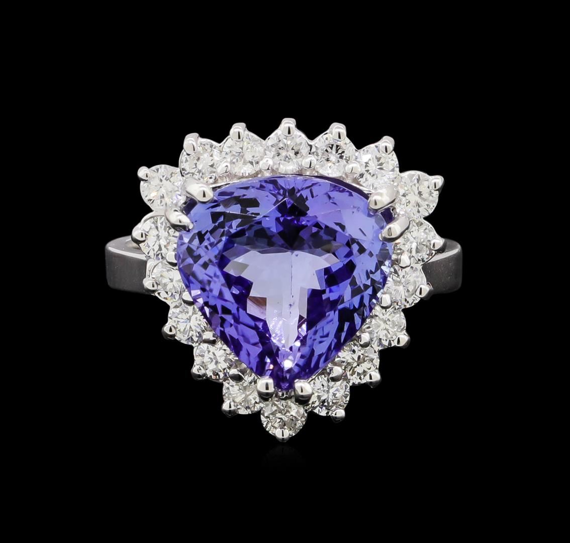 One electronically tested 14KT white gold lady's cast fashion ring with a cathedral basket halo with a bright polish finish. The featured lady's ring has a shank measuring 2.75 millimeters in width. Identified with markings of 'K14'. Condition is new, good workmanship. Containing: One prong set pear modified brilliant cut natural tanzanite, measuring 11.80 x 11.30 x 6.71mm, (depth est.) approximate weight of 5.49ct., clarity is eye clean, medium, moderately strong, violetish blue color, (GIA vB 5/4), cut is very good. Transmitting light with no distortion, transparent. Colored gemstones are presumed to have been subjected to commonly used enhancement processes. Graded in the setting. Eighteen prong set round brilliant cut diamonds, measuring 2.40 - 2.30 x 1.45mm (depth est.) approximate total weight of 18 Stones = 0.88ct. Graded in the setting. Clarity SI-1 to SI-2. Color: H - I Cut Good. Total Weight of Colored Stones 5.49ct.. Total Weight of Diamonds 0.88ct.. Total Weight of Ring 6.20gm. GAS Appraised at $11,565.00.