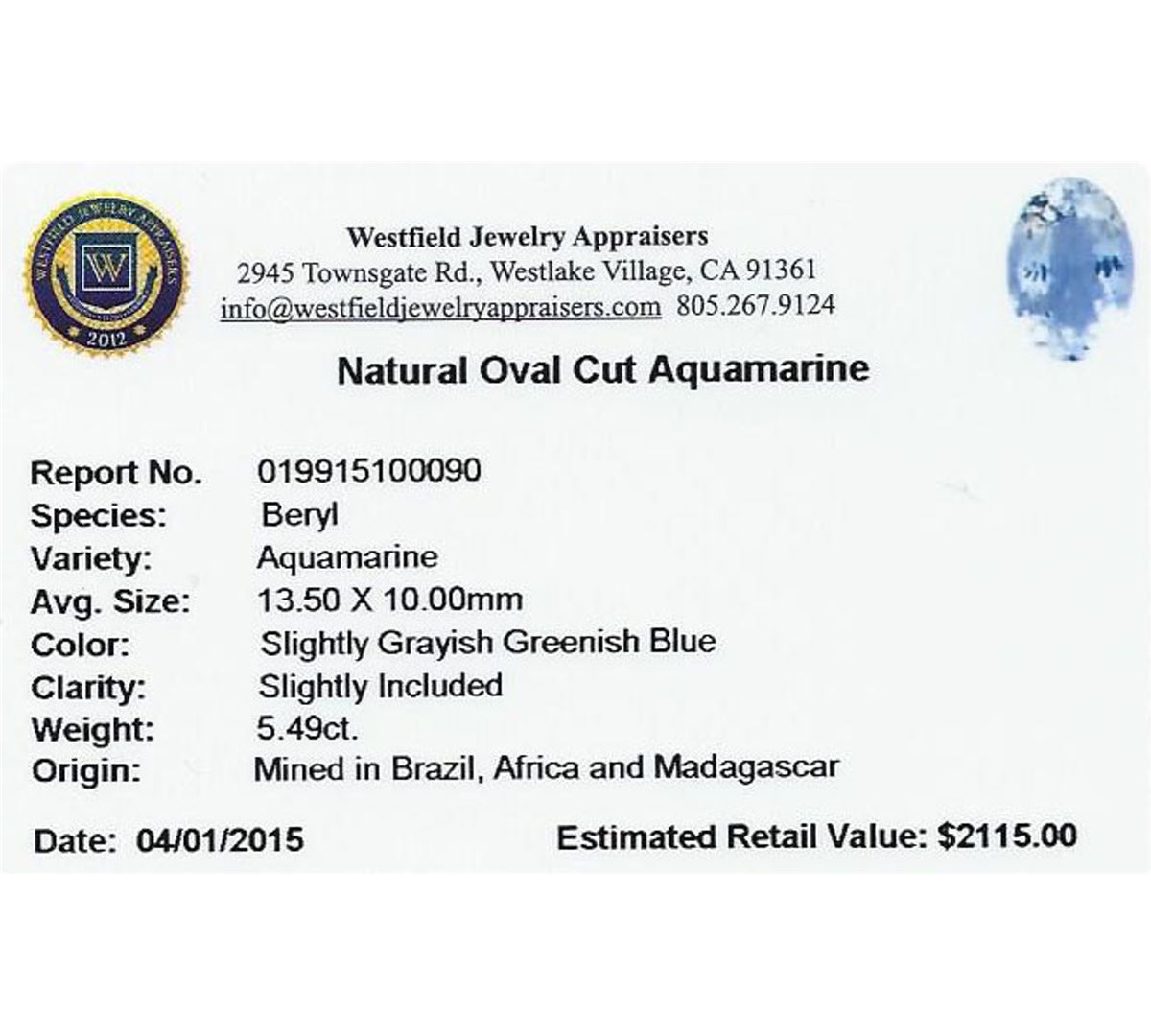One oval cut natural aquamarine exact weight 5.49ct., clarity is slightly included, type I, medium light, very slightly grayish, very slightly greenish blue color, (GIA vslgB 4/3), cut is good. Westfield Appraised at $2,115.00.