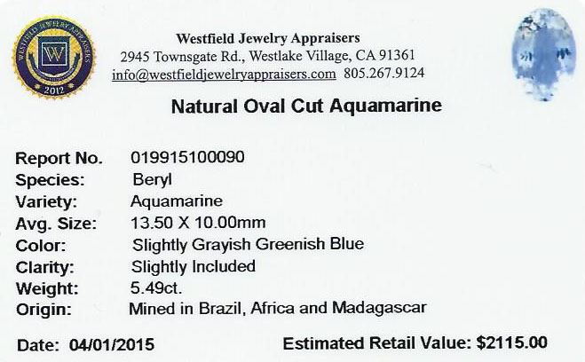 One oval cut natural aquamarine exact weight 5.49ct., clarity is slightly included, type I, medium light, very slightly grayish, very slightly greenish blue color, (GIA vslgB 4/3), cut is good. Westfield Appraised at $2,115.00.