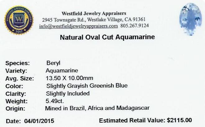 One oval cut natural aquamarine exact weight 5.49ct., clarity is slightly included, type I, medium light, very slightly grayish, very slightly greenish blue color, (GIA vslgB 4/3), cut is good. Westfield Appraised at $2,115.00.