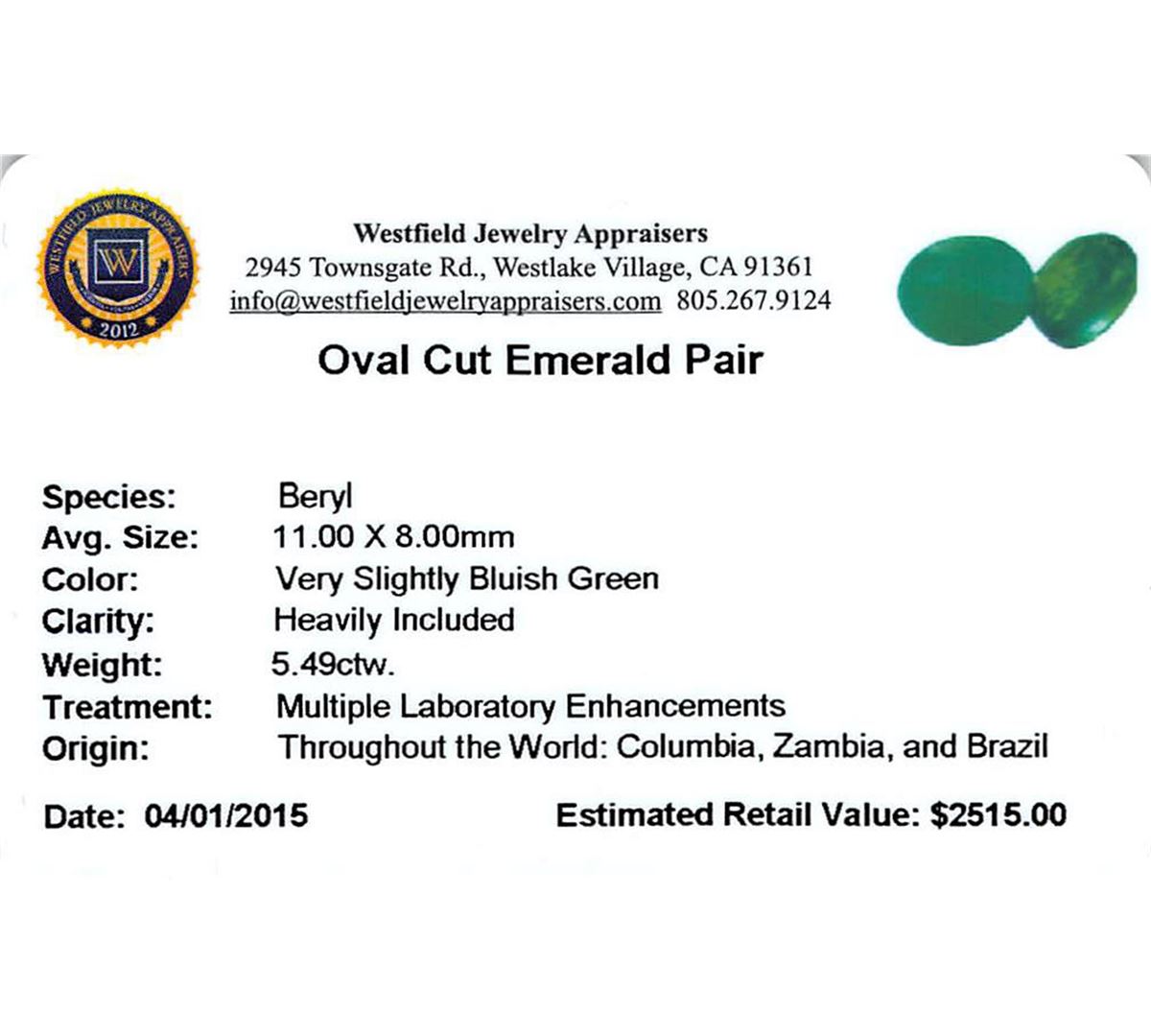 Two oval mixed cut natural emeralds exact total weight 5.49ct., clarity is heavily included, type III, medium dark, very slightly grayish, very slightly bluish green color, (GIA vslbG 6/3), cut is good. Westfield Appraised at $2,515.00.