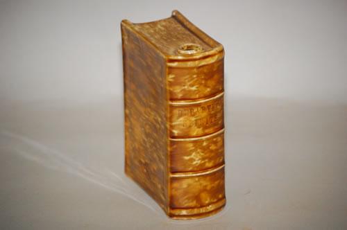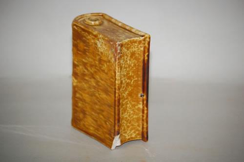 5 5/8" BENNINGTON BOOK FLASK - "DEPARTED SPIRITS" FLINT GLAZE ENAMEL BENNINGTON BOOK FLASK IN MOTTLED BROWN GLAZE W/ YELLOW HIGHLIGHTS (5 5/8" T X 4" W) - APPROX. 1" CORNER CHIP, ANOTHER REPAIRED, WEAR, GLAZE CRAZING, IMPERFECTIONS