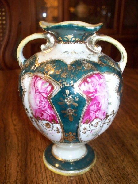 5.5" NIPPON VASE, GREEN W/FLOWERS, DBL HANDLE