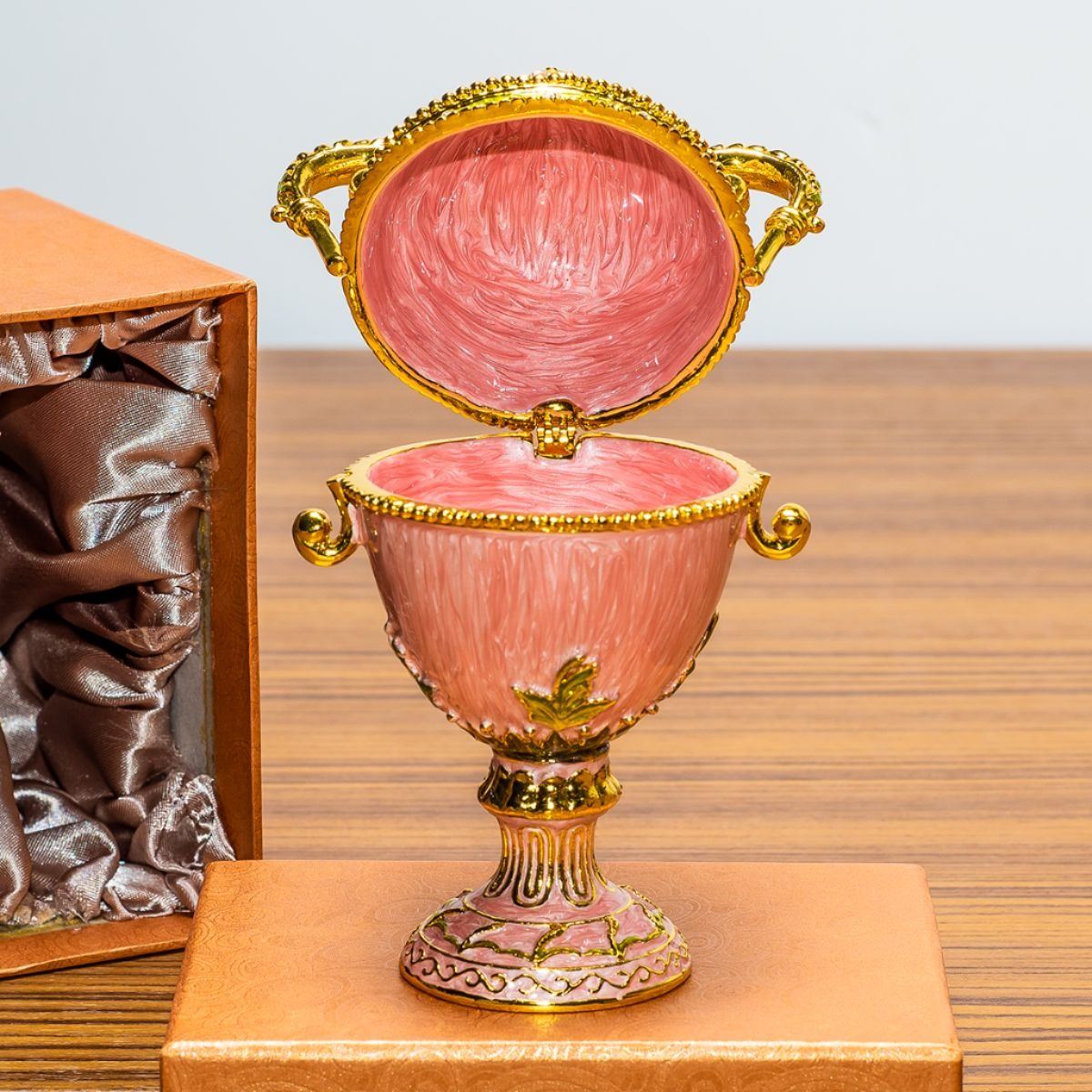You’ll love the elegance of this pink-hued Royal inspired Russian Easter egg. A display stand attached to this beauty. Fashioned from fine pewter. Then it is hand enameled by our skilled artisans. This sparkling egg is adorned with clear crystals and high-polished enamel with golden trim. It opens on a hinge and has a magnetic closure to keep the box securely shut. The piece also comes in a beautiful gift box.