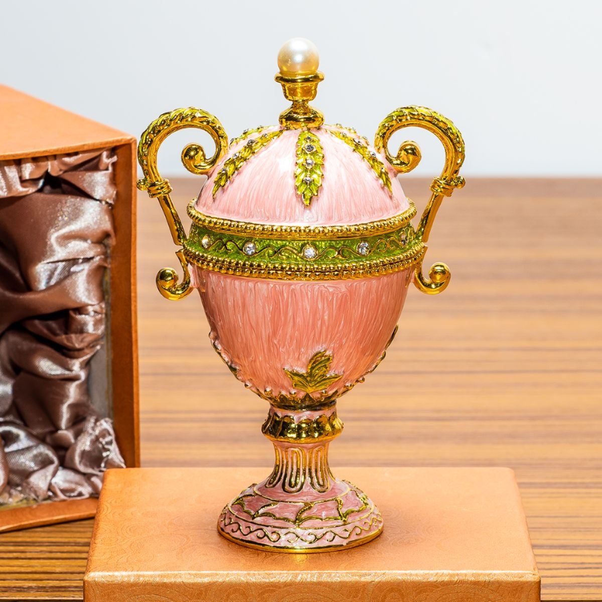 You’ll love the elegance of this pink-hued Royal inspired Russian Easter egg. A display stand attached to this beauty. Fashioned from fine pewter. Then it is hand enameled by our skilled artisans. This sparkling egg is adorned with clear crystals and high-polished enamel with golden trim. It opens on a hinge and has a magnetic closure to keep the box securely shut. The piece also comes in a beautiful gift box.