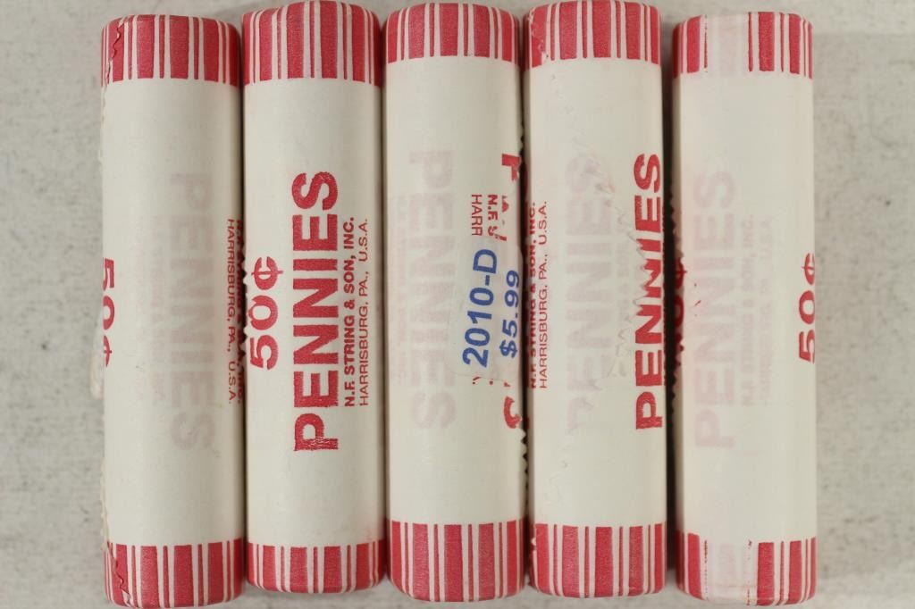 5-50 CENT ROLLS OF 2010-D LINCOLN SHIELD CENTS BU