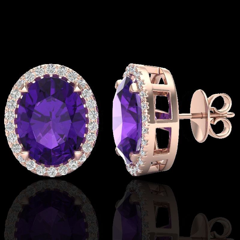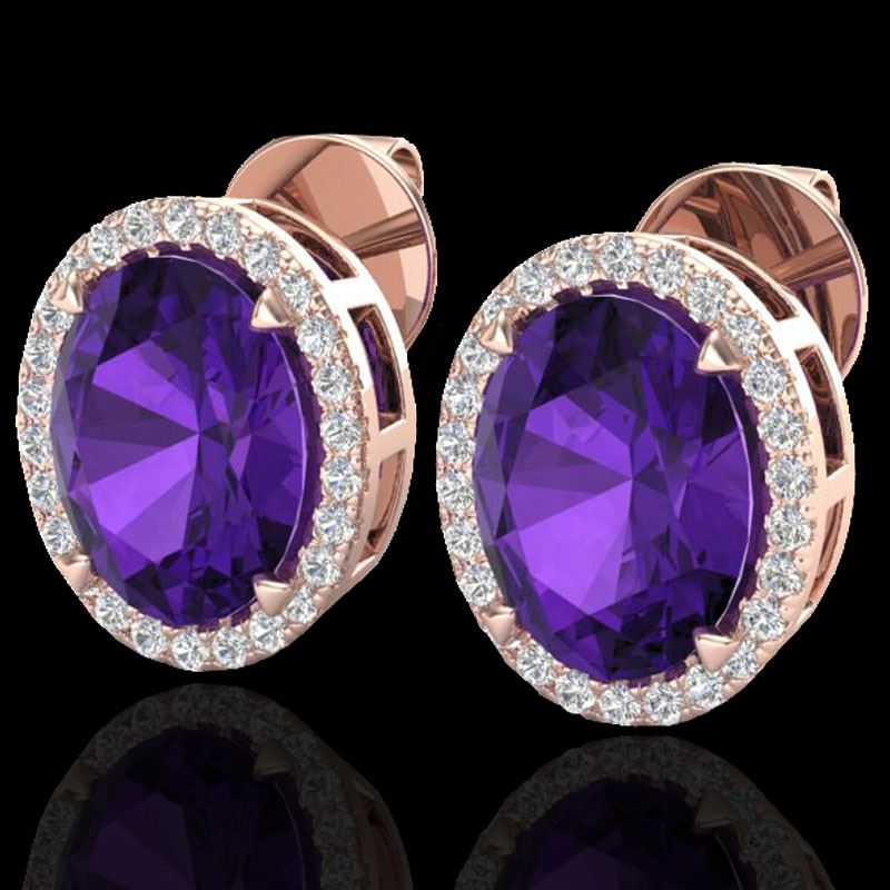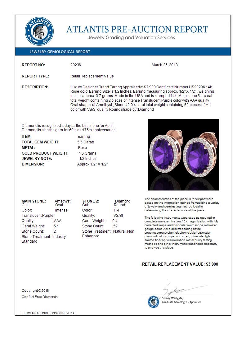 REF-54W8F -20236 ---- 5.50 CTW Amethyst & Micro VS/SI Diamond Halo Earrings 14K Rose Gold ---- Luxury Designer Brand Earring Appraised at $3,900 Certificate Number US20236 14k Rose gold, Earring Size is 1/2 Inches, Earring measuring approx. 1/2" X 1/2" , weighing in total approx. 3.7 grams. Made in the USA and is stamped 14k, Main stone 5.1 carat total weight containing 2 pieces of Intense Translucent Purple color with AAA quality Oval shape cut Amethyst , Stone #2 0.4 carat total weight containing 52 pieces of H-I color with VS/SI quality Round shape cut Diamond