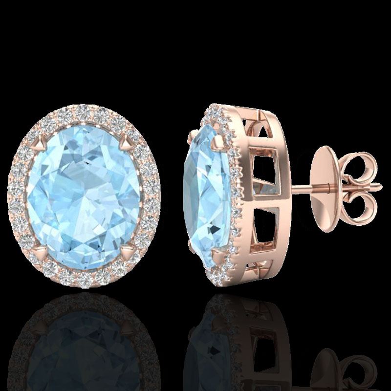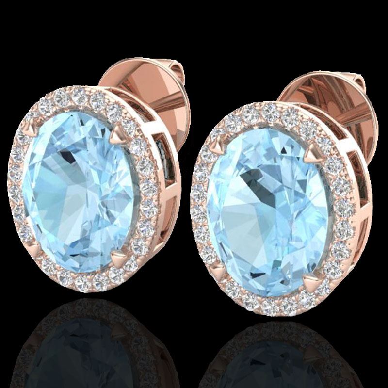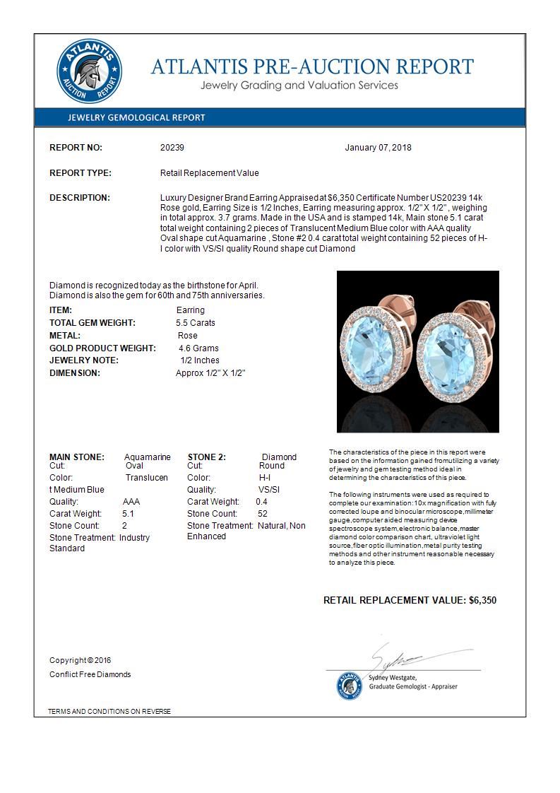 REF-88A8X -20239 ---- 5.50 CTW Aquamarine & Micro VS/SI Diamond Halo Earrings 14K Rose Gold ---- Luxury Designer Brand Earring Appraised at $6,350 Certificate Number US20239 14k Rose gold, Earring Size is 1/2 Inches, Earring measuring approx. 1/2" X 1/2" , weighing in total approx. 3.7 grams. Made in the USA and is stamped 14k, Main stone 5.1 carat total weight containing 2 pieces of Translucent Medium Blue color with AAA quality Oval shape cut Aquamarine , Stone #2 0.4 carat total weight containing 52 pieces of H-I color with VS/SI quality Round shape cut Diamond