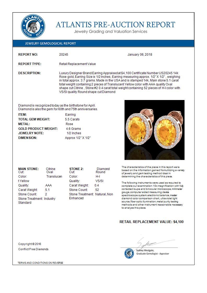 REF-61W8F -20245 ---- 5.50 CTW Citrine & Micro VS/SI Diamond Halo Earrings 14K Rose Gold ---- Luxury Designer Brand Earring Appraised at $4,100 Certificate Number US20245 14k Rose gold, Earring Size is 1/2 Inches, Earring measuring approx. 1/2" X 1/2" , weighing in total approx. 3.7 grams. Made in the USA and is stamped 14k, Main stone 5.1 carat total weight containing 2 pieces of Translucent Yellow color with AAA quality Oval shape cut Citrine , Stone #2 0.4 carat total weight containing 52 pieces of H-I color with VS/SI quality Round shape cut Diamond