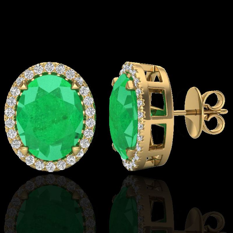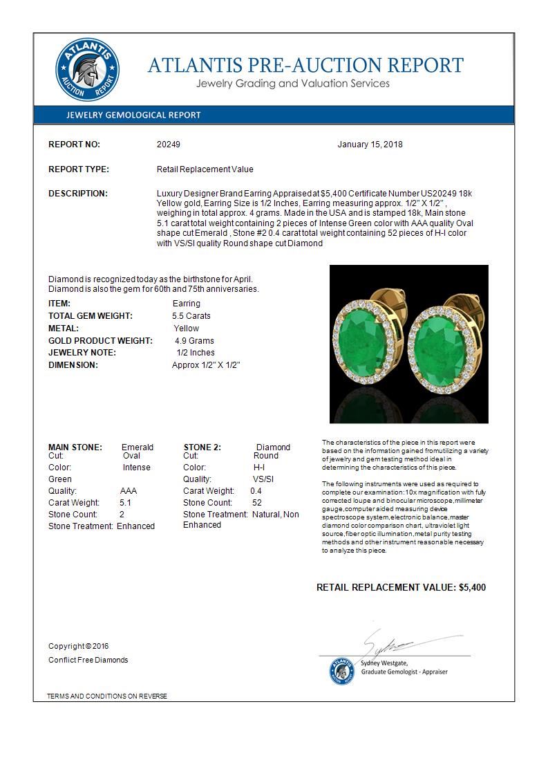 REF-81X8T -20249 ---- 5.50 CTW Emerald & Micro VS/SI Diamond Halo Earrings 18K Yellow Gold ---- Luxury Designer Brand Earring Appraised at $5,400 Certificate Number US20249 18k Yellow gold, Earring Size is 1/2 Inches, Earring measuring approx. 1/2" X 1/2" , weighing in total approx. 4 grams. Made in the USA and is stamped 18k, Main stone 5.1 carat total weight containing 2 pieces of Intense Green color with AAA quality Oval shape cut Emerald , Stone #2 0.4 carat total weight containing 52 pieces of H-I color with VS/SI quality Round shape cut Diamond