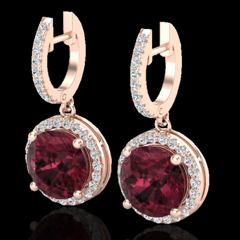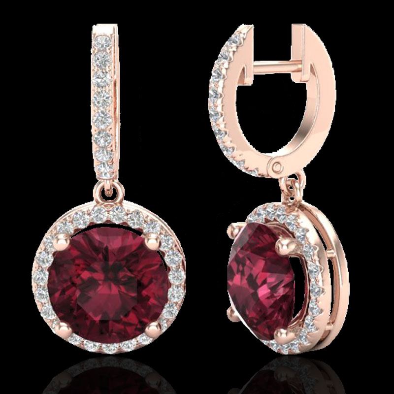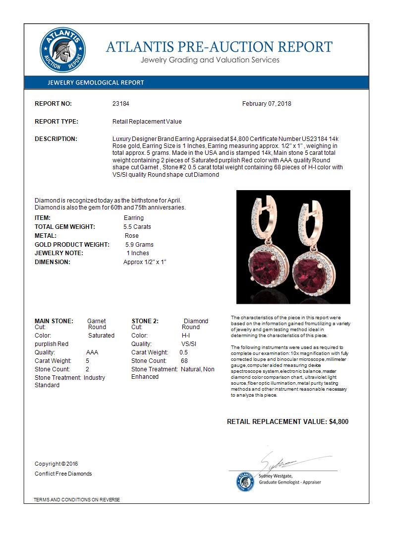 REF-72N8Y -23184 ---- 5.50 CTW Garnet & Micro Pave VS/SI Diamond Designer Halo 14K Rose Gold ---- Luxury Designer Brand Earring Appraised at $4,800 Certificate Number US23184 14k Rose gold, Earring Size is 1 Inches, Earring measuring approx. 1/2" x 1" , weighing in total approx. 5 grams. Made in the USA and is stamped 14k, Main stone 5 carat total weight containing 2 pieces of Saturated purplish Red color with AAA quality Round shape cut Garnet , Stone #2 0.5 carat total weight containing 68 pieces of H-I color with VS/SI quality Round shape cut Diamond