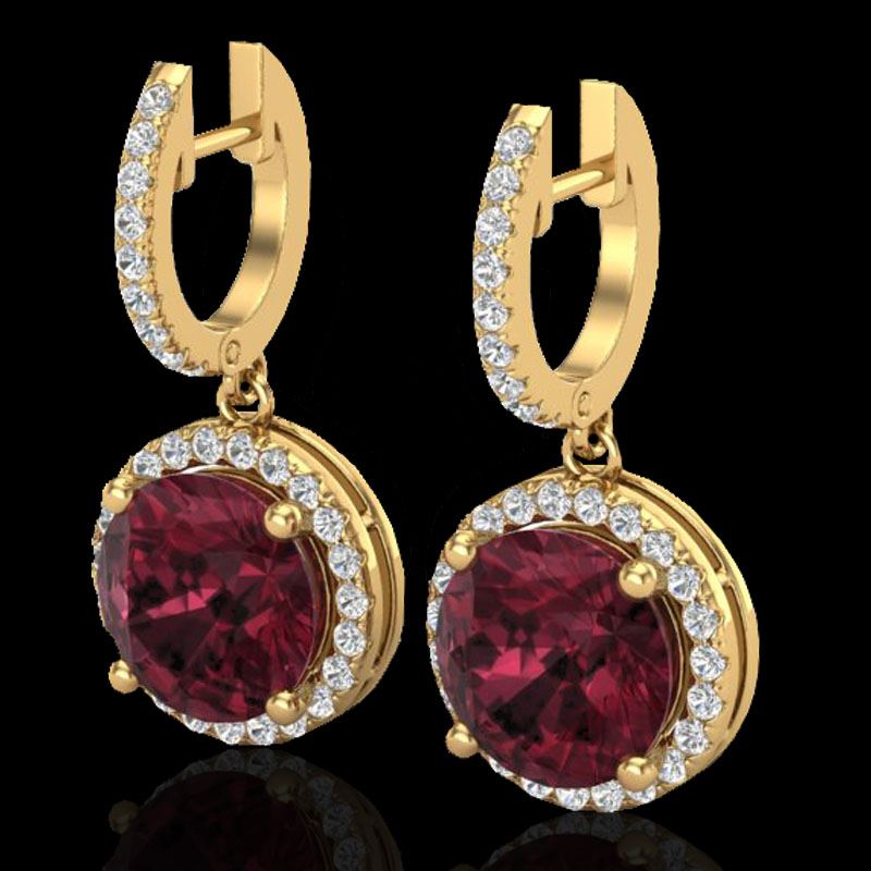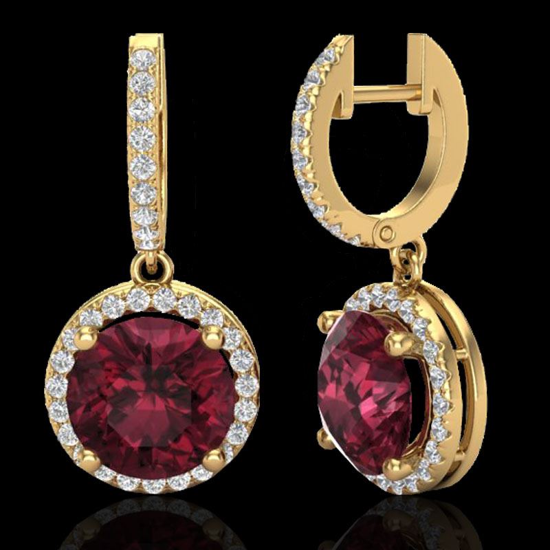 REF-87W8F -23185 ---- 5.50 CTW Garnet & Micro Pave VS/SI Diamond Designer Halo 18K Yellow Gold ---- Luxury Designer Brand Earring Appraised at $5,800 Certificate Number US23185 18k Yellow gold, Earring Size is 1 Inches, Earring measuring approx. 1/2" x 1" , weighing in total approx. 6 grams. Made in the USA and is stamped 18k, Main stone 5 carat total weight containing 2 pieces of Saturated purplish Red color with AAA quality Round shape cut Garnet , Stone #2 0.5 carat total weight containing 68 pieces of H-I color with VS/SI quality Round shape cut Diamond