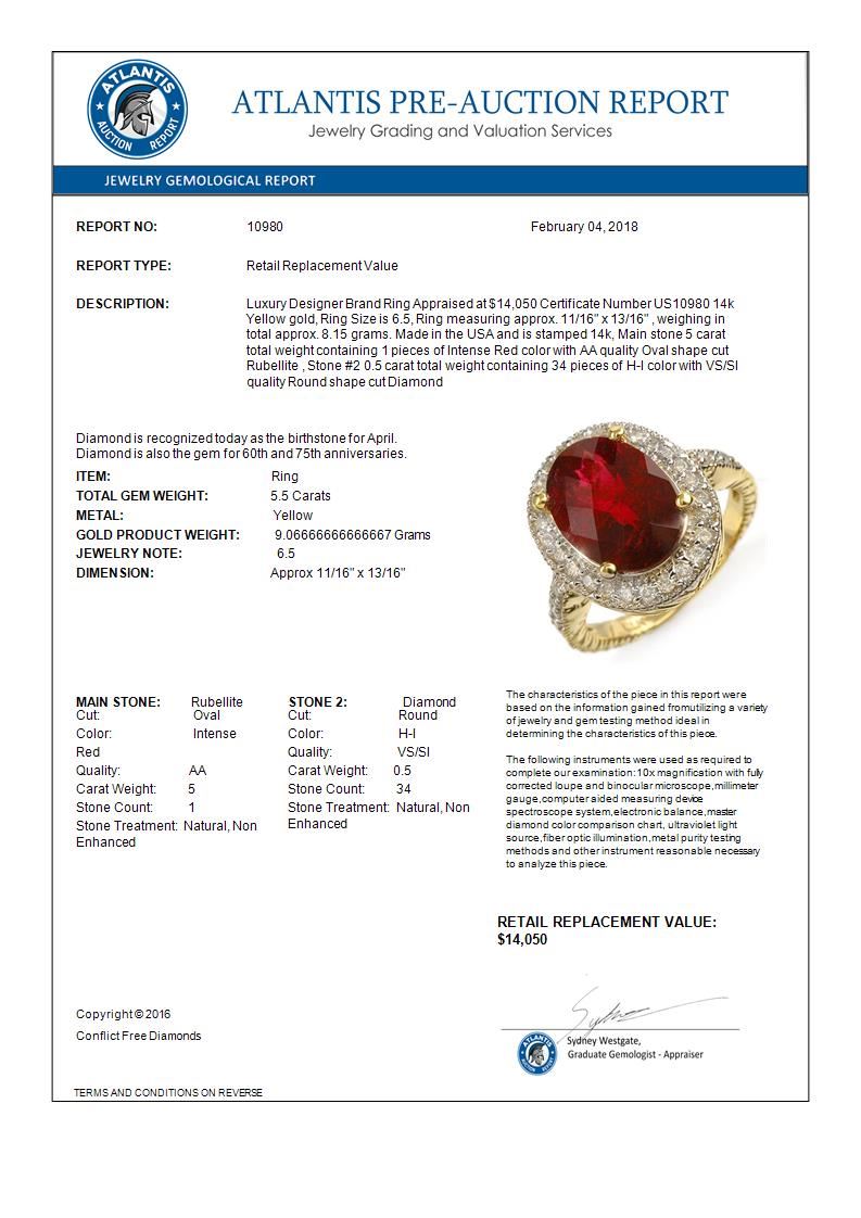 REF-182X8T -10980 ---- 5.50 CTW Rubellite & Diamond Ring 14K Yellow Gold ---- Luxury Designer Brand Ring Appraised at $14,050 Certificate Number US10980 14k Yellow gold, Ring Size is 6.5, Ring measuring approx. 11/16" x 13/16" , weighing in total approx. 8.15 grams. Made in the USA and is stamped 14k, Main stone 5 carat total weight containing 1 pieces of Intense Red color with AA quality Oval shape cut Rubellite , Stone #2 0.5 carat total weight containing 34 pieces of H-I color with VS/SI quality Round shape cut Diamond