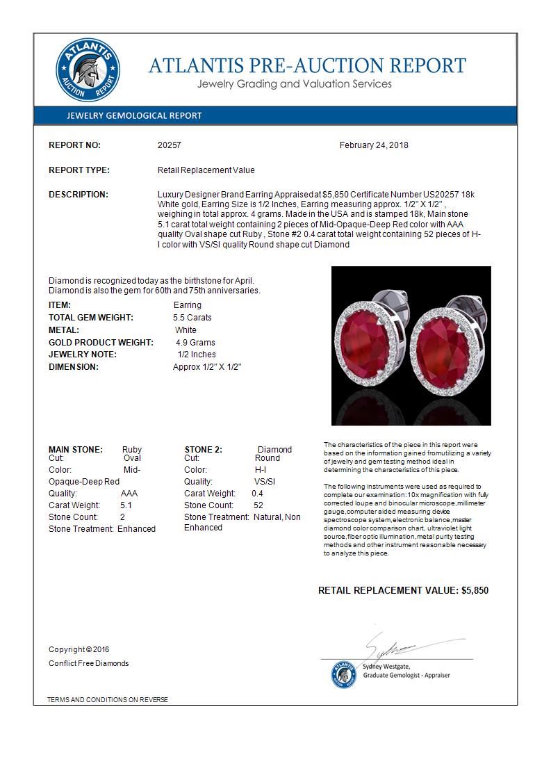 REF-81N8Y -20257 ---- 5.50 CTW Ruby & Micro VS/SI Diamond Halo Solitaire Earrings 18K White Gold ---- Luxury Designer Brand Earring Appraised at $5,850 Certificate Number US20257 18k White gold, Earring Size is 1/2 Inches, Earring measuring approx. 1/2" X 1/2" , weighing in total approx. 4 grams. Made in the USA and is stamped 18k, Main stone 5.1 carat total weight containing 2 pieces of Mid-Opaque-Deep Red color with AAA quality Oval shape cut Ruby , Stone #2 0.4 carat total weight containing 52 pieces of H-I color with VS/SI quality Round shape cut Diamond