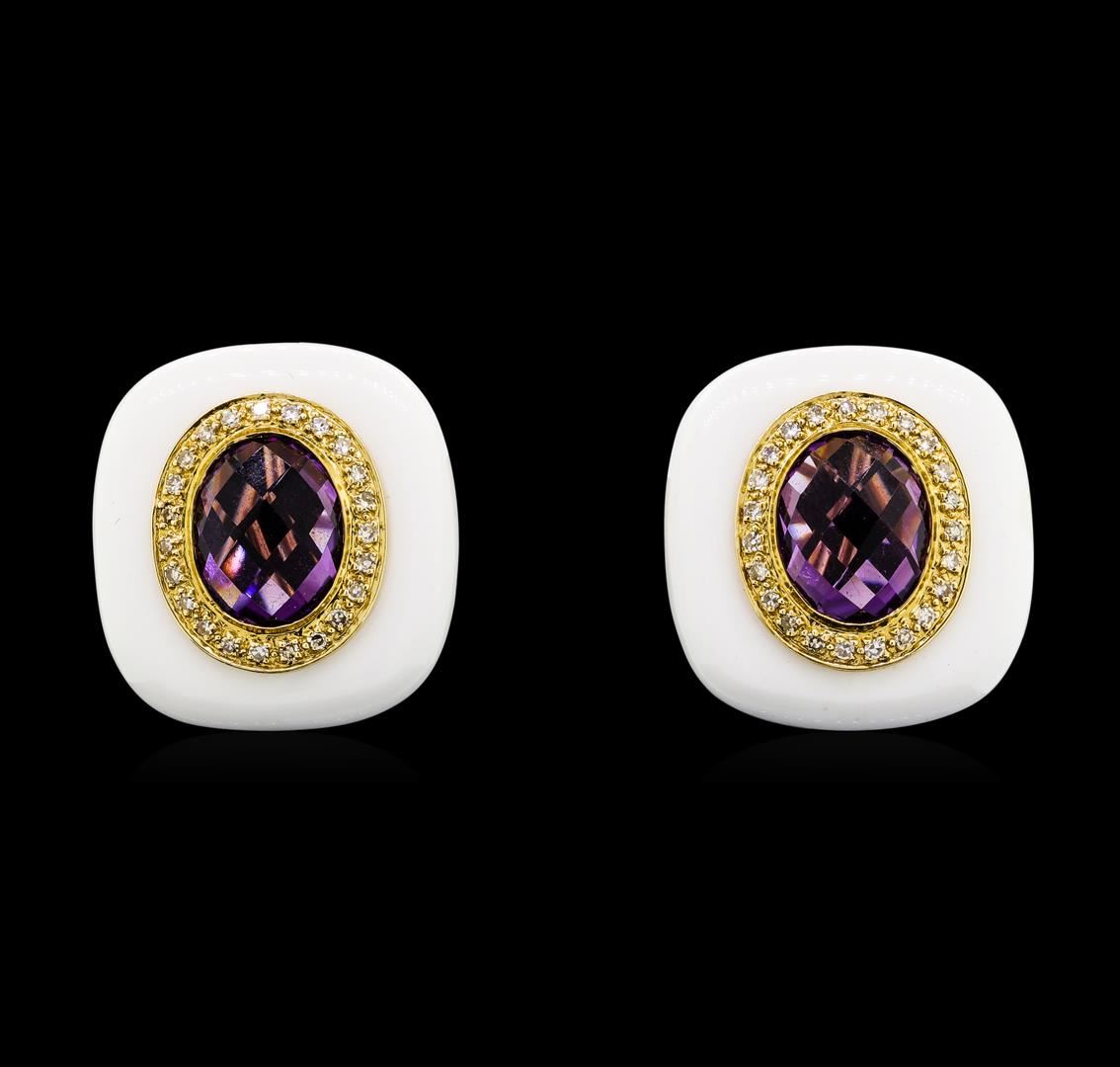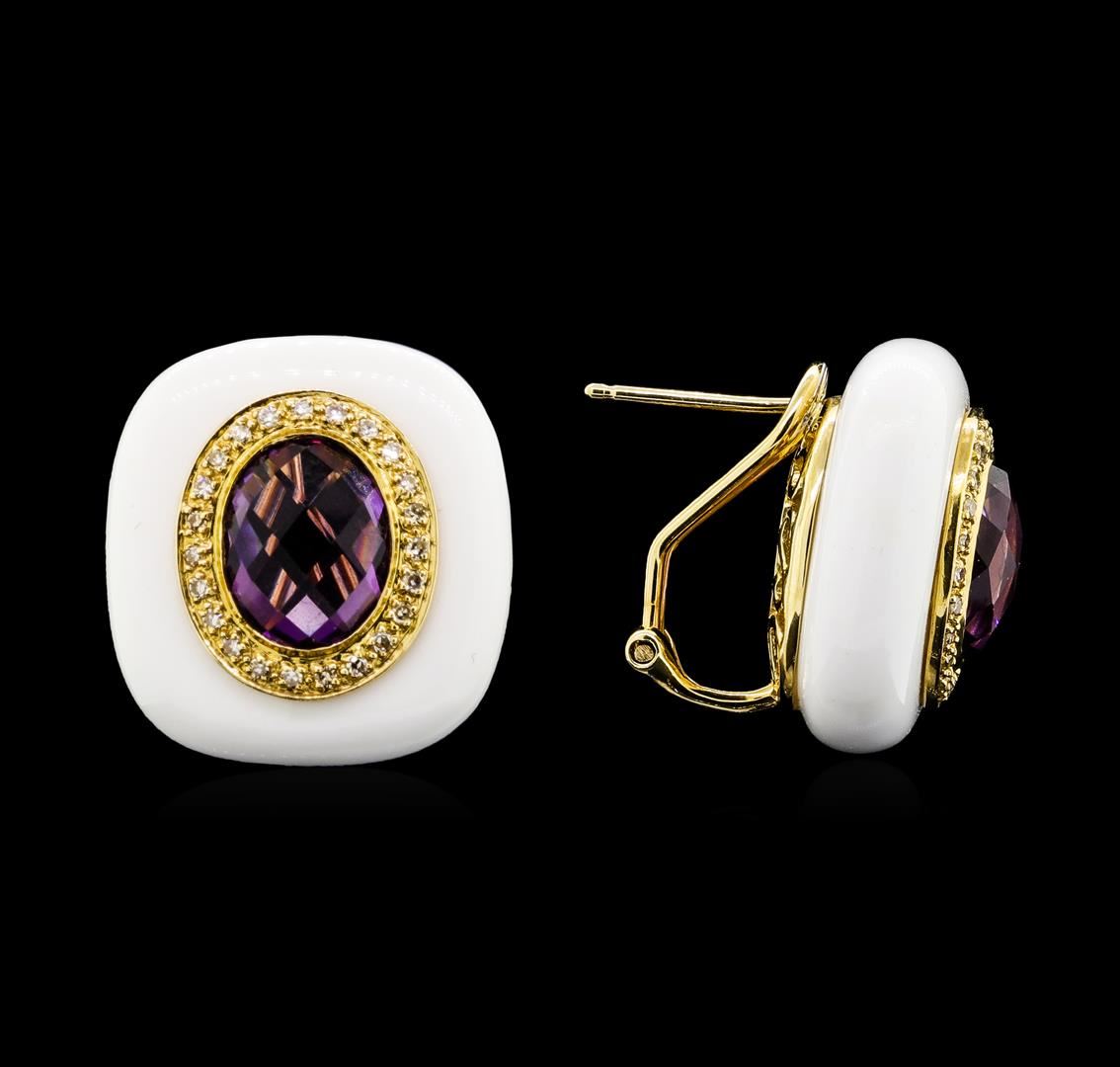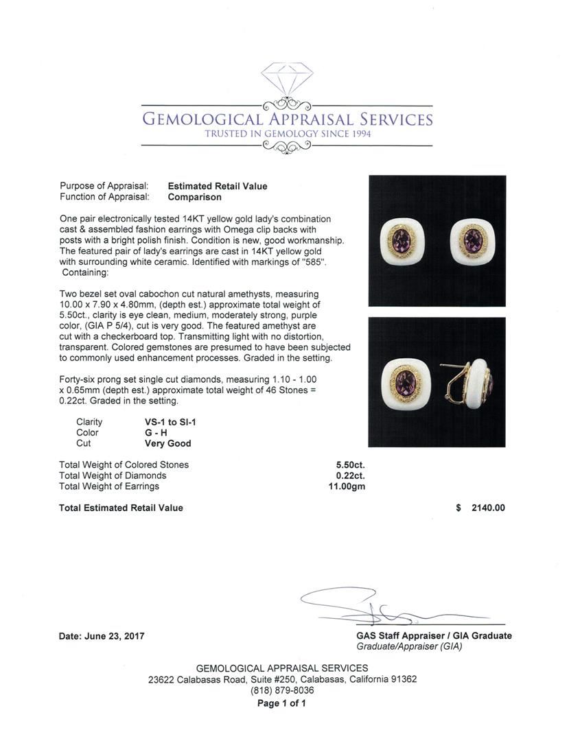 One pair electronically tested 14KT yellow gold lady's combination cast & assembled fashion earrings with Omega clip backs with posts with a bright polish finish. The featured pair of lady's earrings are cast in 14KT yellow gold with surrounding white ceramic. Identified with markings of '585'. Condition is new, good workmanship. Containing: Two bezel set oval cabochon cut natural amethysts, measuring 10.00 x 7.90 x 4.80mm, (depth est.) approximate total weight of 5.50ct., clarity is eye clean, medium, moderately strong, purple color, (GIA P 5/4), cut is very good. The featured amethyst are cut with a checkerboard top. Transmitting light with no distortion, transparent. Colored gemstones are presumed to have been subjected to commonly used enhancement processes. Graded in the setting. Forty-Six prong set single cut diamonds, measuring 1.10 - 1.00 x 0.65mm (depth est.) approximate total weight of 46 Stones = 0.22ct. Graded in the setting. Color G - H Clarity VS-1 to SI-1 Cut Very Good. Total Weight of Colored Stones 5.50ct.. Total Weight of Diamonds 0.22ct.. Total Weight of Earrings 11.00gm GAS Appraised at $2140.00. GAS Appraised at $2,140.00.