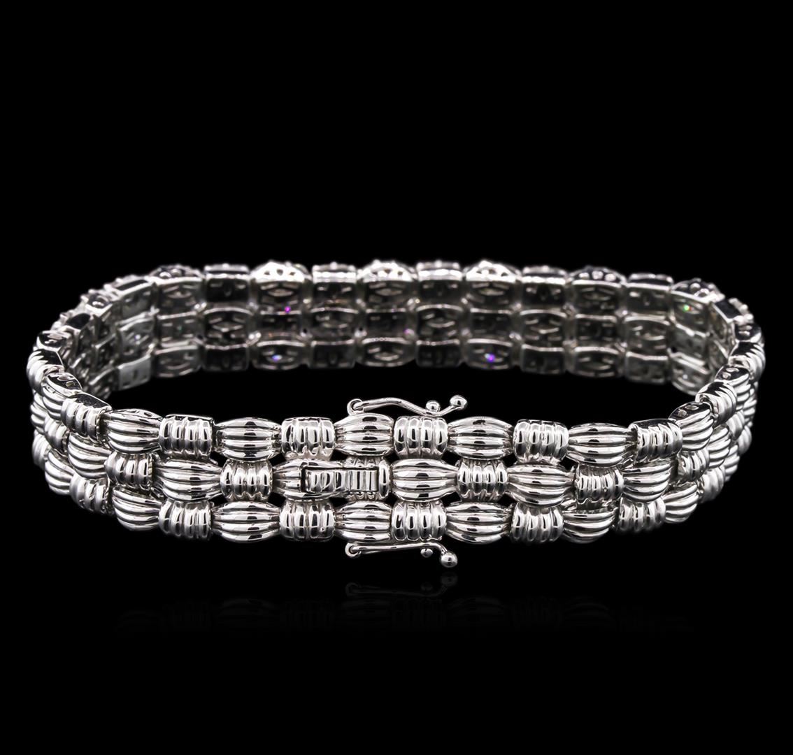 One electronically tested 14KT white gold lady's combination cast & assembled fashion bracelet with a tongue clasp with foldover safety with a bright polish finish. The featured lady's bracelet has a triple row basket weave motif and measures 7.25 inches in length. Identified with markings of "K14". Condition is new, good workmanship. Containing: Two Hundred Twenty-Six prong set round brilliant cut diamonds, measuring 1.90 - 1.80 x 1.17mm (depth est.) approximate total weight of 226 Stones = 5.50ct. Graded in the setting. Clarity: SI-2 to I-1. Color: H - Good. Total Weight of Diamonds 5.50ct. Total Weight of Bracelet 36.20gm at $14785.00.. GAS Appraised at $14,785.00.