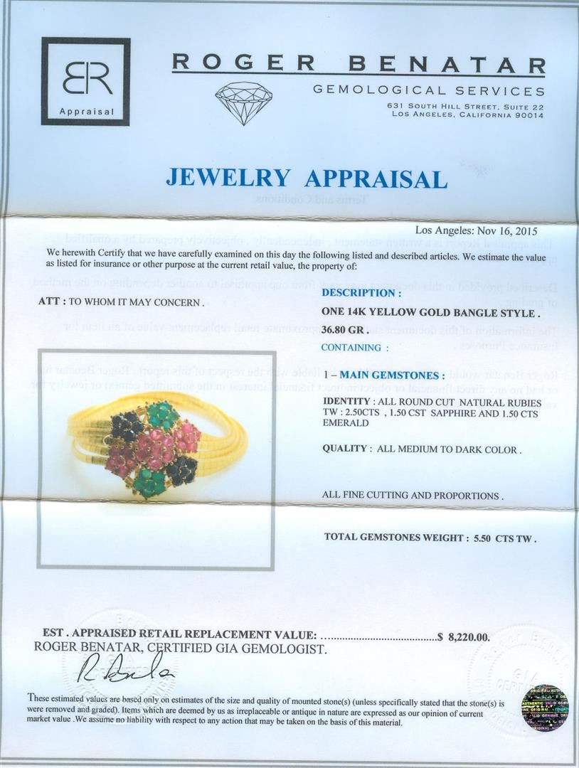 One 14KT yellow gold bangle style bracelet weighing 36.80 grams containing rubies weighing 2.50ctw, sapphires weighing 1.50ctw, and emeralds weighing 1.50ctw, all with medium to dark color. RBGS Appraised at $8,220.00.