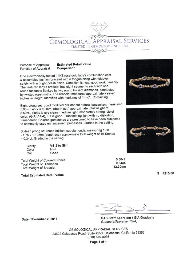 One electronically tested 14KT rose gold lady's combination cast & assembled fashion bracelet with a tongue clasp with foldover safety with a bright polish finish. The featured lady's bracelet has eight segments each with one round tanzanite flanked by two round brilliant diamonds, connected by twisted rope motifs. The bracelet measures approximately seven inches in length. Identified with markings of '14K'. Condition is new, good workmanship. Containing: Eight prong set round modified brilliant cut natural tanzanites, measuring 5.65 - 5.45 x 3.10 mm, (depth est.) approximate total weight of 5.50ct., clarity is eye clean, medium light, moderately strong, violet color, (GIA V 4/4), cut is good. Transmitting light with no distortion, transparent. Colored gemstones are presumed to have been subjected to commonly used enhancement processes. Graded in the setting. Sixteen prong set round brilliant cut diamonds, measuring 1.80 - 1.75 x 1.10mm (depth est.) approximate total weight of 16 Stones = 0.34ct. Graded in the setting. Clarity VS-2 to SI-1. Color: H - I Cut Good. Total Weight of Colored Stones 5.50ct.. Total Weight of Diamonds 0.34ct.. Total Weight of Bracelet 12.30gm. GAS Appraised at $4,215.00.