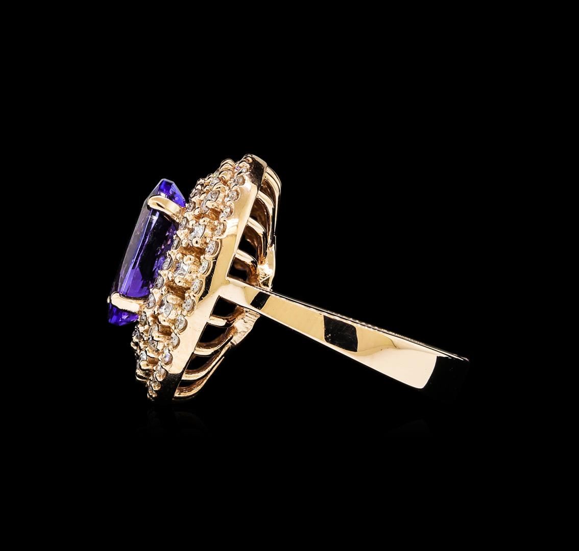 One electronically tested 14KT rose gold lady's cast fashion ring with a triple basket halo with a bright polish finish. The featured lady's ring has a shank measuring 4.04 millimeters wide. Identified with markings of 'K14'. Condition is new, good workmanship. Containing: One prong set oval modified brilliant cut natural tanzanite, measuring 12.69 x 10.32 x 5.62mm, (depth est.) 5%. bulge factor, approximate weight of 5.50ct., clarity is eye clean, medium, moderately strong, bluish violet color, (GIA bV 5/4), cut is good. Transmitting light with no distortion, transparent. Colored gemstones are presumed to have been subjected to commonly used enhancement processes. Graded in the setting. Sixteen prong set round brilliant cut diamonds, measuring 2.30 - 2.20 x 1.37mm (depth est.) approximate total weight of 16 Stones = 0.68ct. Graded in the setting. Clarity SI-1 to I-1. Color: H - I Cut Good Sixty-Two prong set round brilliant cut diamonds, measuring 1.50 - 1.40 x 0.90mm (depth est.) approximate total weight of 62 Stones = 0.72ct. Graded in the setting. Clarity SI-1 to I-1. Color: H - I Cut Good. Total Weight of Colored Stones 5.50ct.. Total Weight of Diamonds 1.40ct.. Total Weight of Ring 10.80gm GAS Appraised at $13,440.00.