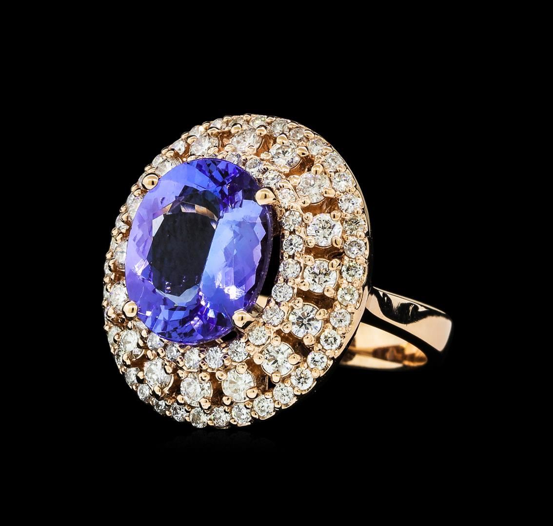 One electronically tested 14KT rose gold lady's cast fashion ring with a triple basket halo with a bright polish finish. The featured lady's ring has a shank measuring 4.04 millimeters wide. Identified with markings of 'K14'. Condition is new, good workmanship. Containing: One prong set oval modified brilliant cut natural tanzanite, measuring 12.69 x 10.32 x 5.62mm, (depth est.) 5%. bulge factor, approximate weight of 5.50ct., clarity is eye clean, medium, moderately strong, bluish violet color, (GIA bV 5/4), cut is good. Transmitting light with no distortion, transparent. Colored gemstones are presumed to have been subjected to commonly used enhancement processes. Graded in the setting. Sixteen prong set round brilliant cut diamonds, measuring 2.30 - 2.20 x 1.37mm (depth est.) approximate total weight of 16 Stones = 0.68ct. Graded in the setting. Clarity SI-1 to I-1. Color: H - I Cut Good Sixty-Two prong set round brilliant cut diamonds, measuring 1.50 - 1.40 x 0.90mm (depth est.) approximate total weight of 62 Stones = 0.72ct. Graded in the setting. Clarity SI-1 to I-1. Color: H - I Cut Good. Total Weight of Colored Stones 5.50ct.. Total Weight of Diamonds 1.40ct.. Total Weight of Ring 10.80gm GAS Appraised at $13,440.00.